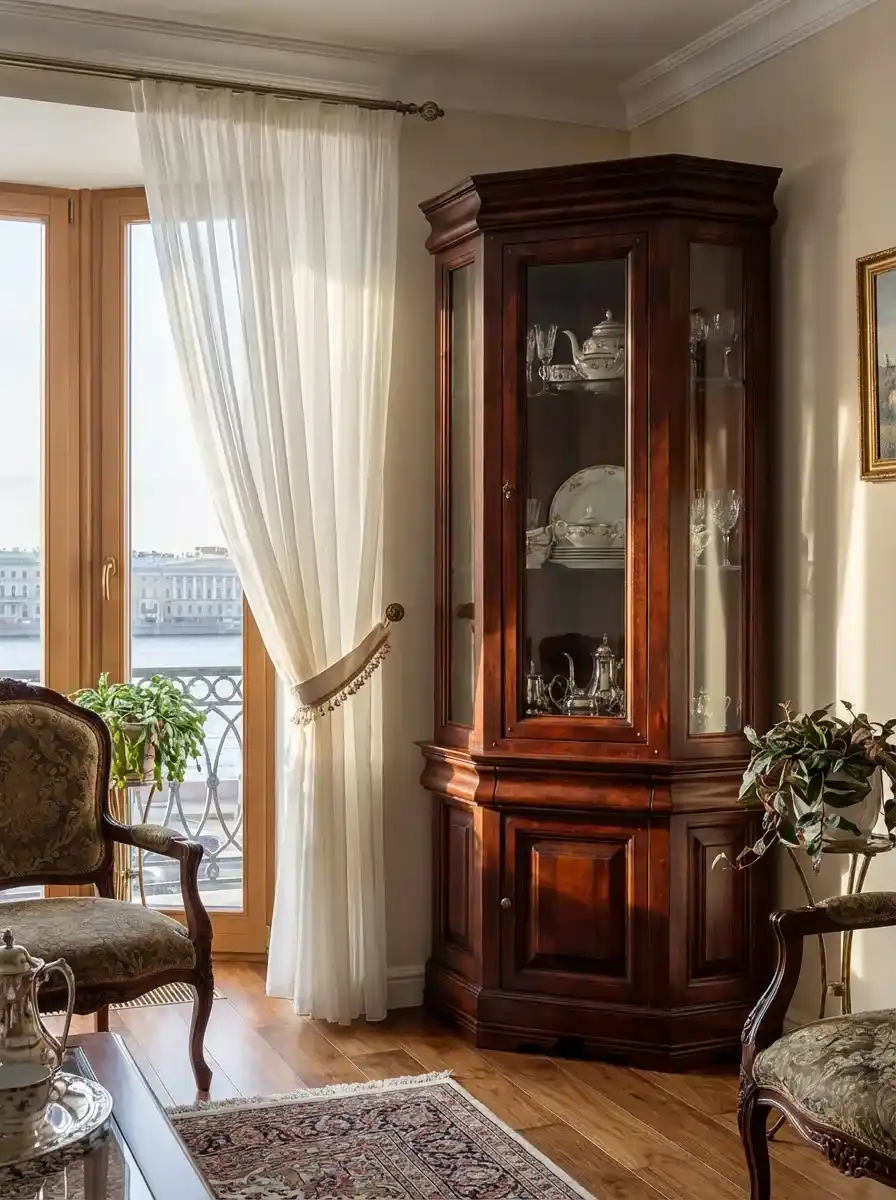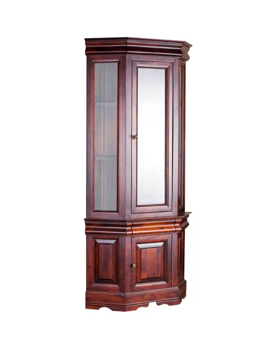 У витрины остекленная дверца и остекленные боковые стенки. За дверцей расположено отделение с полками. Между витриной и тумбой есть небольшой выдвижной ящик для мелочей. На дверцу устанавливается ручка или замок с ключом, по выбору. Фасад и боковые стенки тумбы с филёнками. Размеры шкафа (ШхГлхВ) 880х525х1810 мм, вес 103 кг. Высота нижней тумбы 610 мм, высота витрины 1200 мм. Поставляется в собранном виде, гарантия на изделие – 1 год.