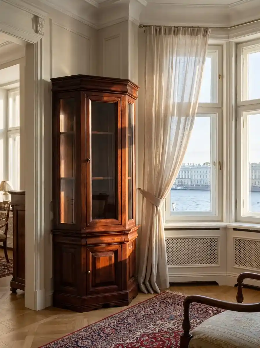 Шкаф с тумбой и витриной «Луи Филипп ОВ 04» выполнен в классическом стиле, изготавливается из массива ольхи или дуба и может быть окрашен в любой цвет по RAL, на выбор. Шкаф имеет рельефный карниз и невысокие устойчивые ножки.