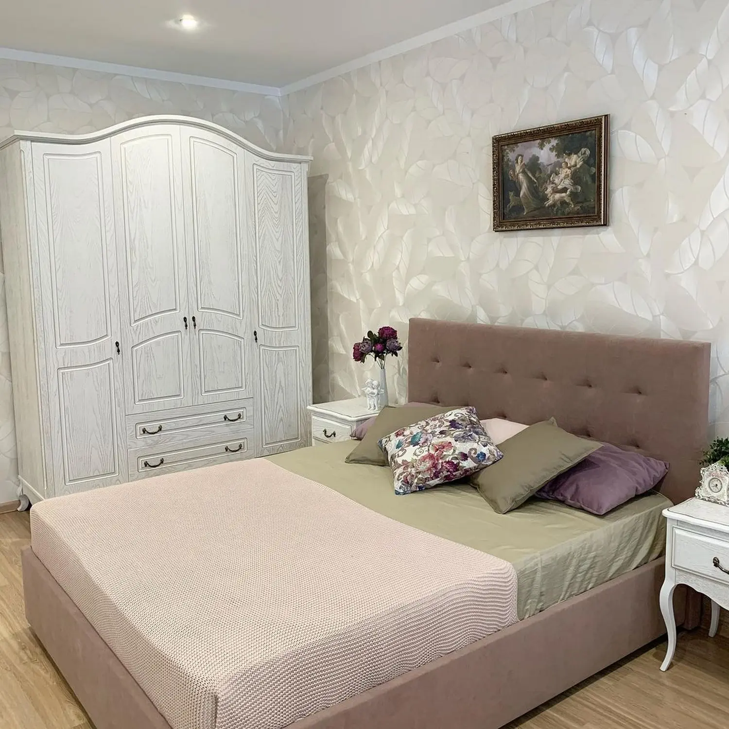 За счет мягкого изголовья кровать выглядит уютной.