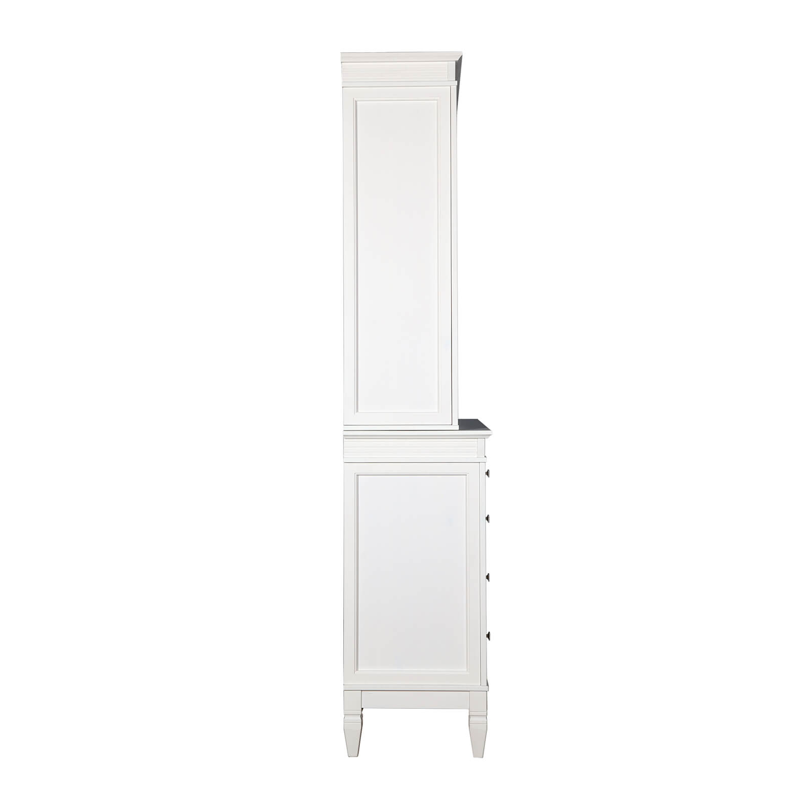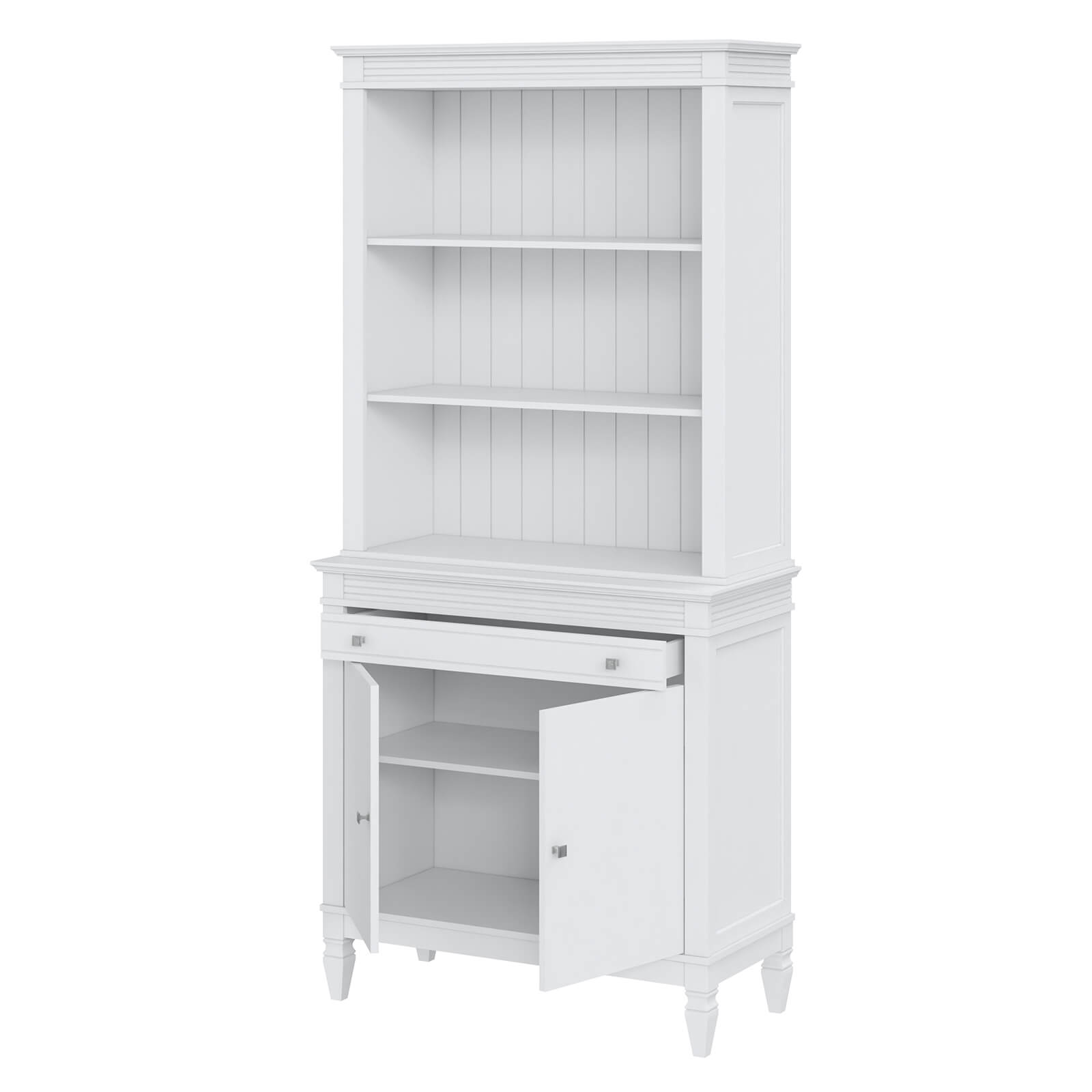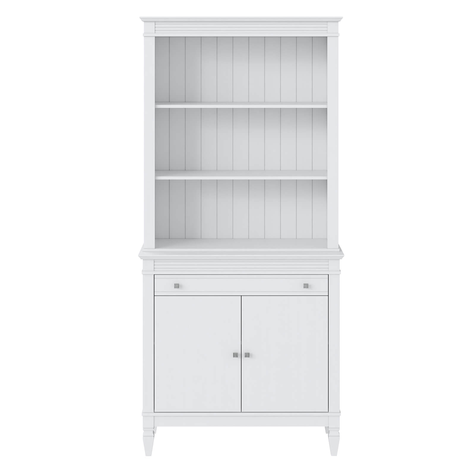 Буфет укомплектован двумя полками сверху, одной полкой снизу за распашными дверями и одним ящиком.