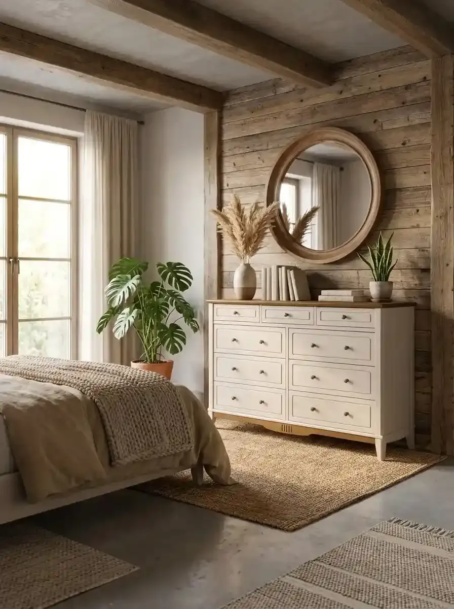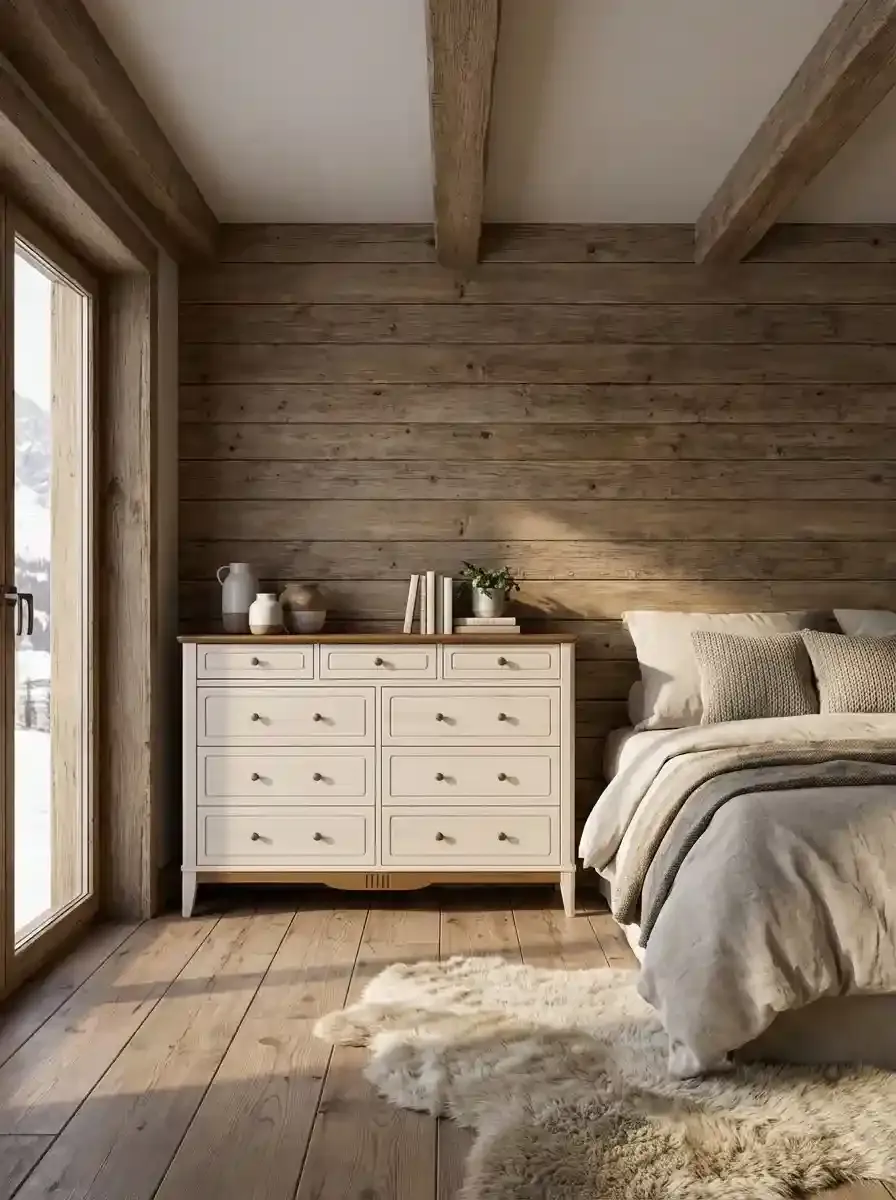 Оригинальный дизайн: Комод выполнен в лаконичном скандинавском стиле. Фасады украшены простой декоративной фрезеровкой, а на ящиках установлены металлические ручки-кнопки с эффектом старения.
