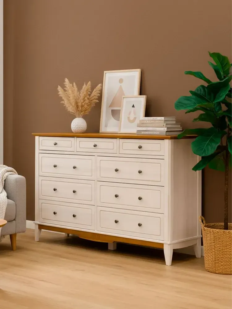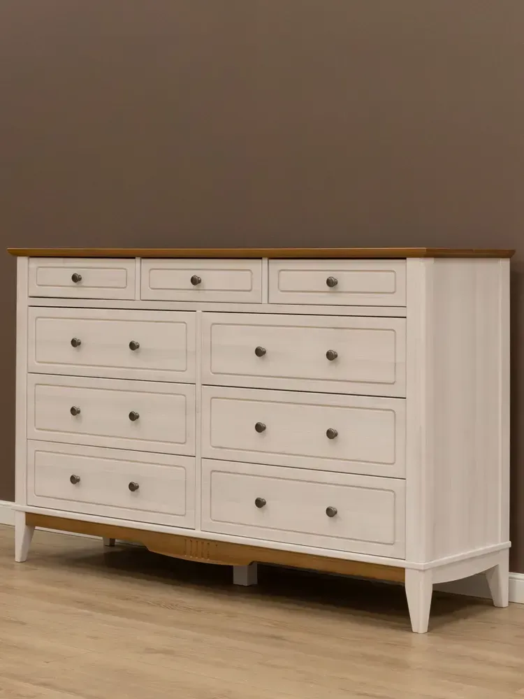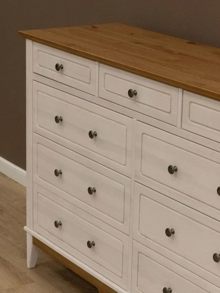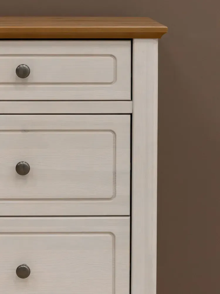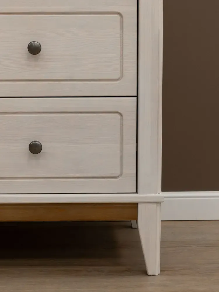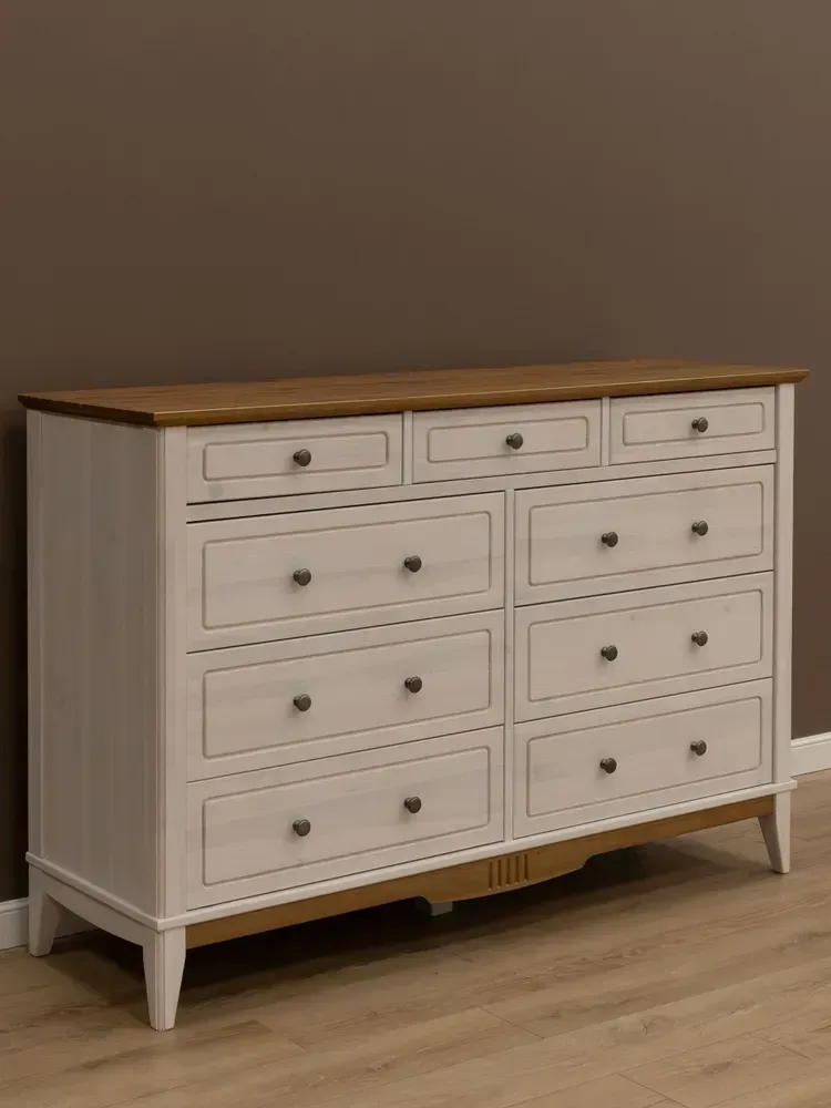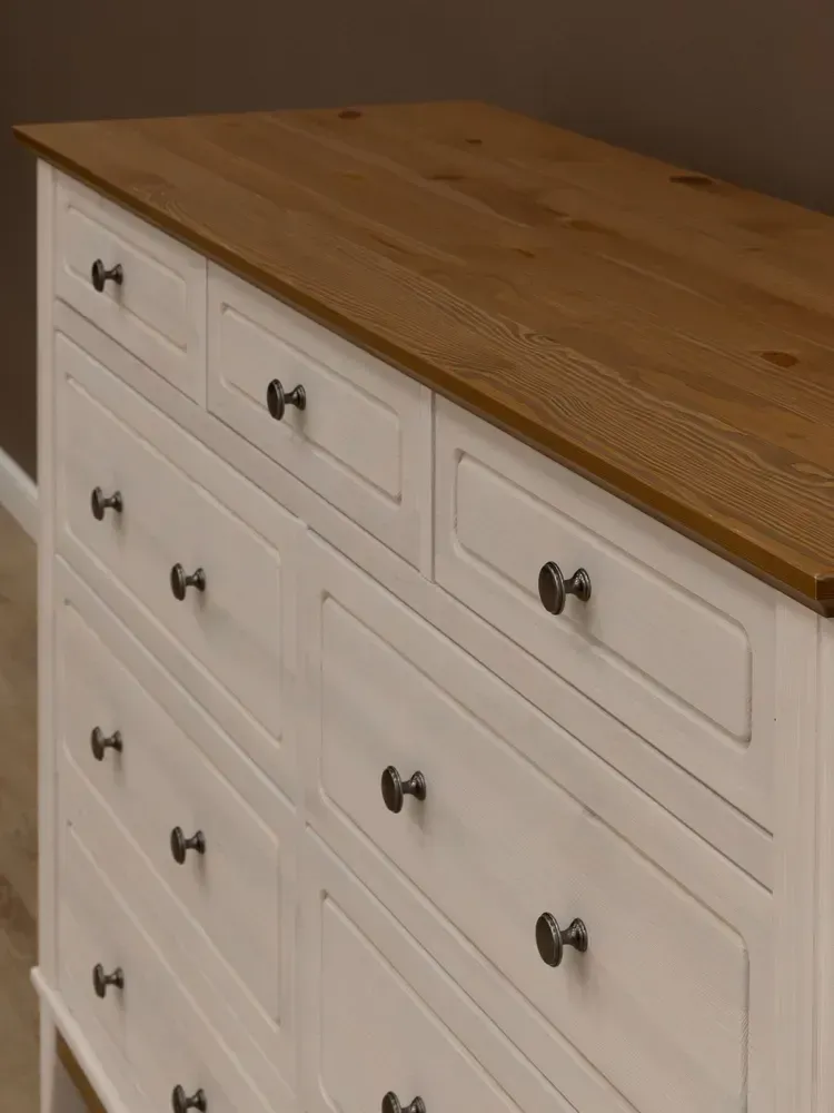 Оригинальное цветовое решение: Корпус комода выдержан в белом тоне, крышка и нижняя декоративная планка окрашены в тёплый цвет антик, через который просвечивает текстура дерева. Донья ящиков сделаны из оргалита белого цвета, стенки ящиков окрашены в цвет корпуса.