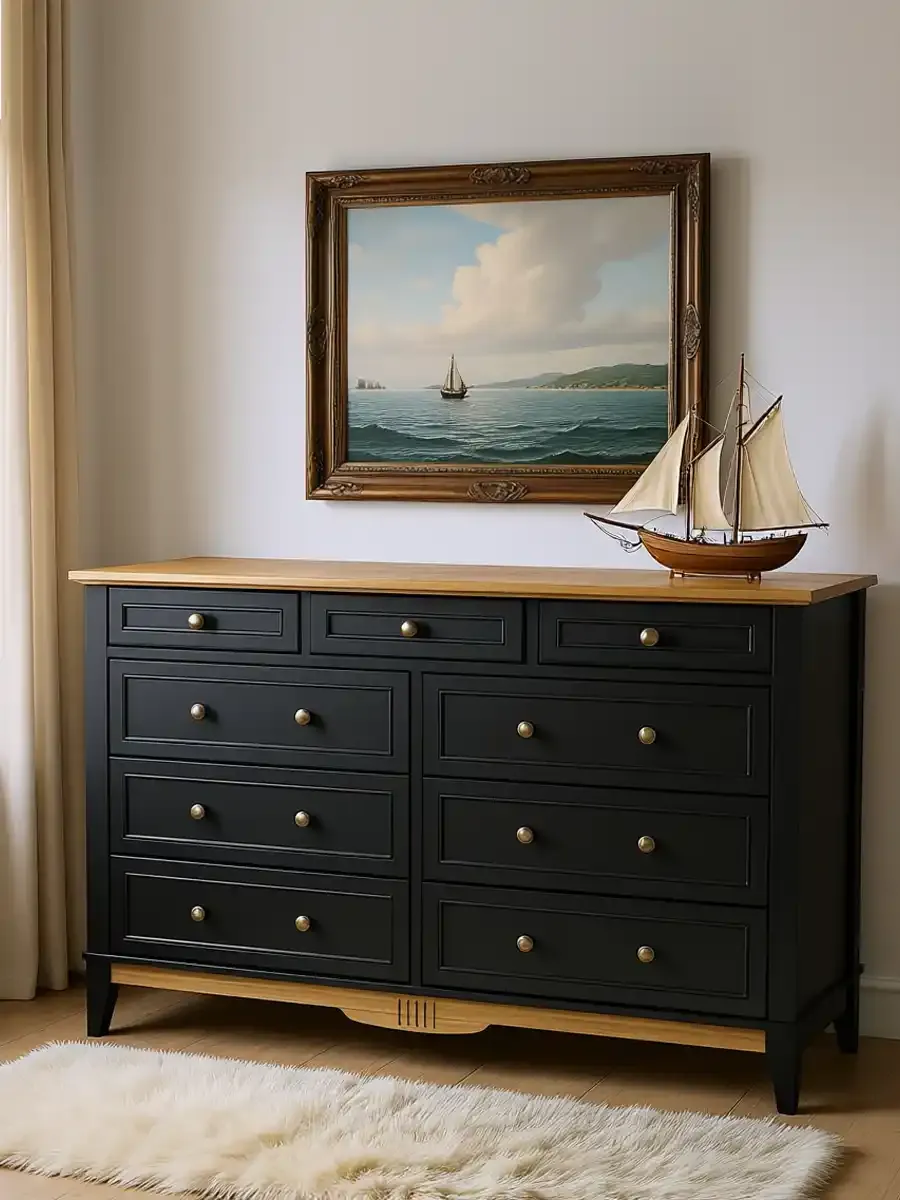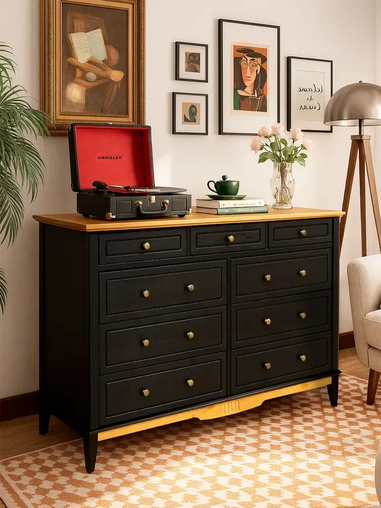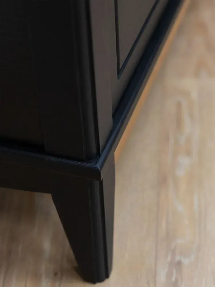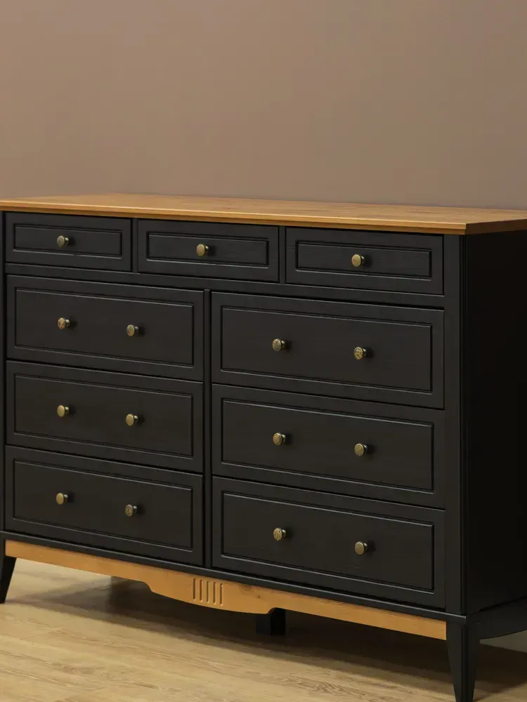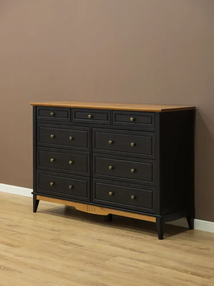 Оригинальное цветовое решение: Корпус комода выдержан в строгом черном цвете, крышка и нижняя декоративная планка окрашены в тёплый цвет антик, через который просвечивает текстура дерева. Донья ящиков сделаны из оргалита цвета венге, стенки ящиков окрашены в цвет корпуса. Также Вы можете купить эту модель комода в отделках «белый/антик» и «серый/антик».
