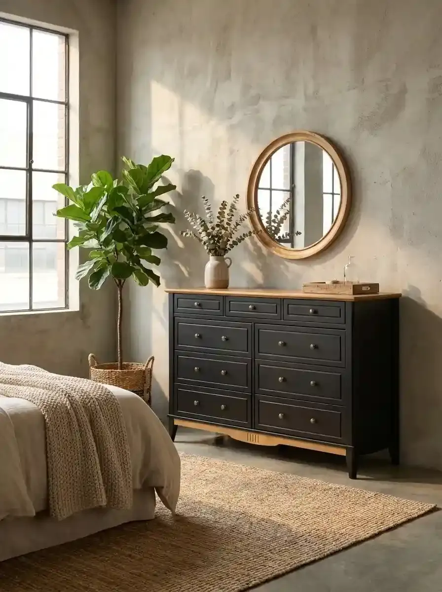 Оригинальный дизайн: Комод выполнен в лаконичном скандинавском стиле. Фасады украшены простой декоративной фрезеровкой, а на ящиках установлены металлические ручки-кнопки с эффектом старения.