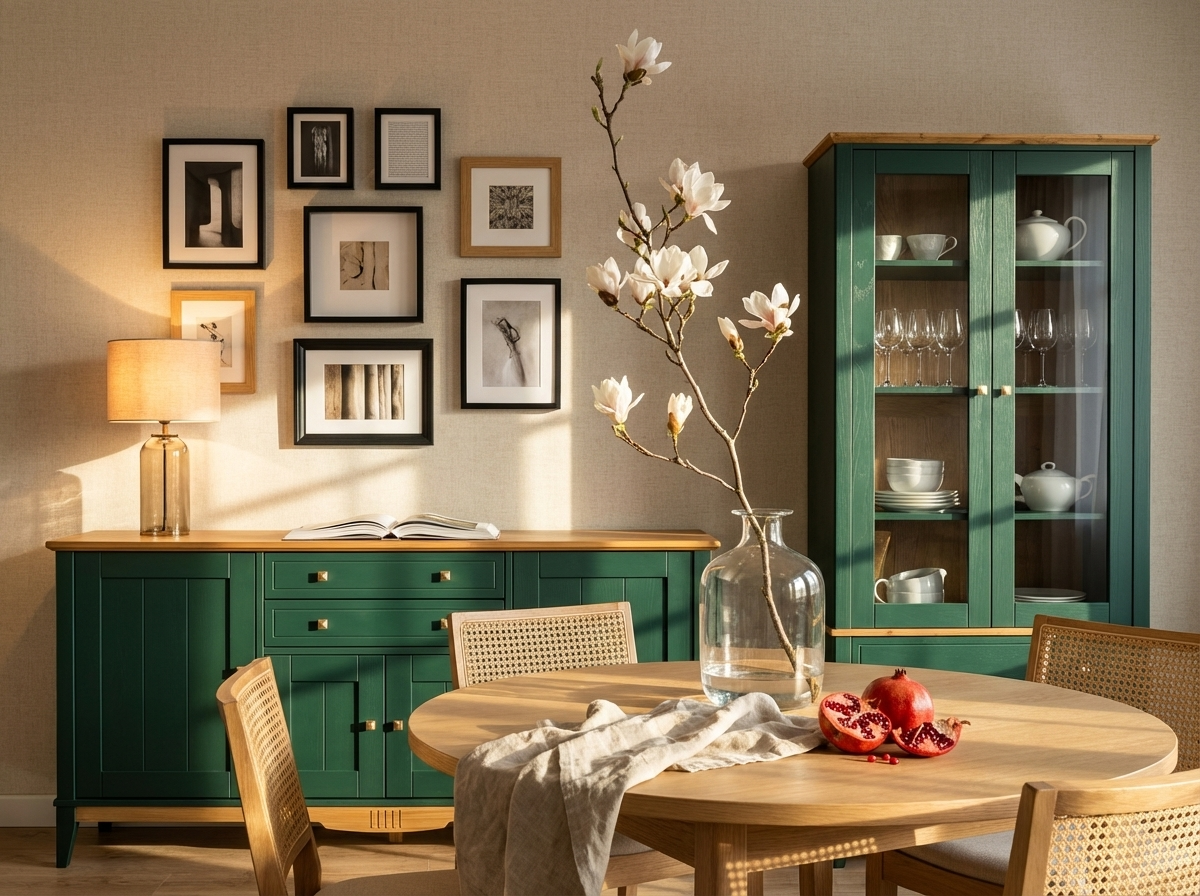 Корпус и фасад комода окрашены в благородный зеленый цвет, крышка и нижняя декоративная планка – в цвет антик. Эта модель комода также доступна в сочетаниях цветов «белый кварц/антик» и «черный сапфир/антик» и «серый жемчуг/антик». Для окрашивания применяются материалы шведской фирмы Becker Acroma: стойкие, без резких запахов, безопасные для здоровья. Фасады и нижняя планка украшены декоративной фрезеровкой, ручки из металла с искусственным старением.