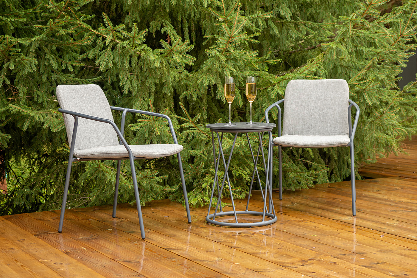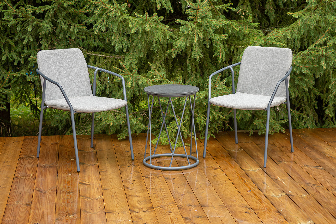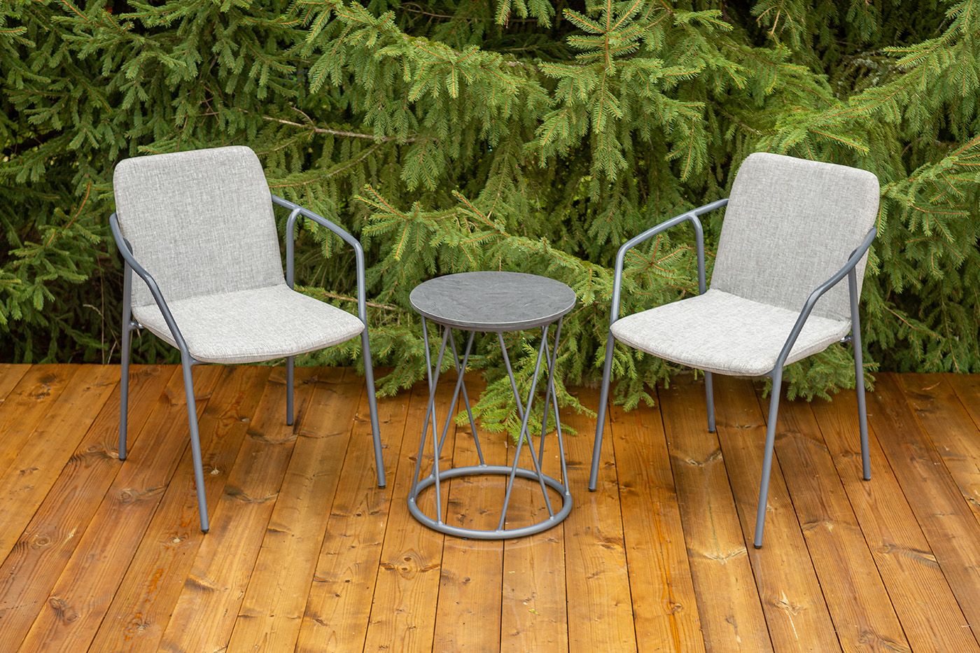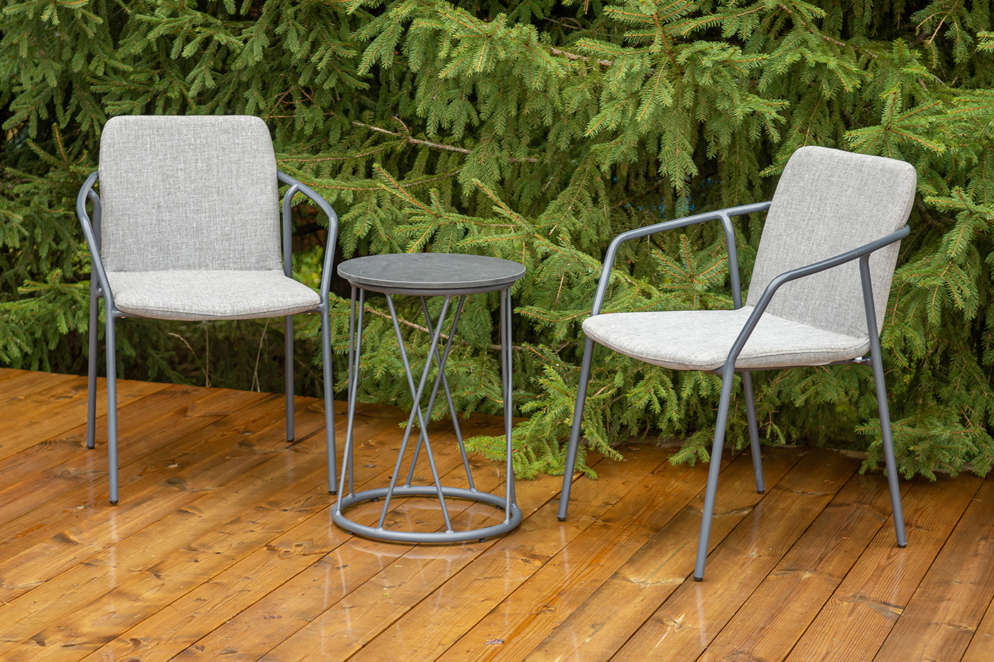 Кофейный комплект «Марокко» на две персоны — компактное и стильное решение для балкона, небольшой гостиной, террасы или другого пространства с ограниченной площадью. В комплект входят два стула «Марокко» (575×600×800 мм) из текстилена Nanotex с алюминиевым каркасом в темно‑сером цвете (RAL7024) и круглый журнальный столик «Колумбия» (400×400×550 мм) с алюминиевым каркасом и столешницей из монолитного компакт‑пластика HPL (12 мм) в оттенке «серый гранит». Мебель отличается прочностью, легкостью, устойчивостью к влаге и ультрафиолету, проста в уходе и гармонично впишется в интерьер домашней библиотеки, зимнего сада, веранды или балкона. "Марокко" стул из текстилена nanotex, каркас алюминий темно-серый (RAL7024), цвет серый 2шт. 575Х600Х800, "Колумбия" журнальный стол из HPL круглый Ø40 H55, каркас из алюминия темно-серый (RAL 7024), цвет столешницы "серый гранит" 1шт. 400Х400Х550,