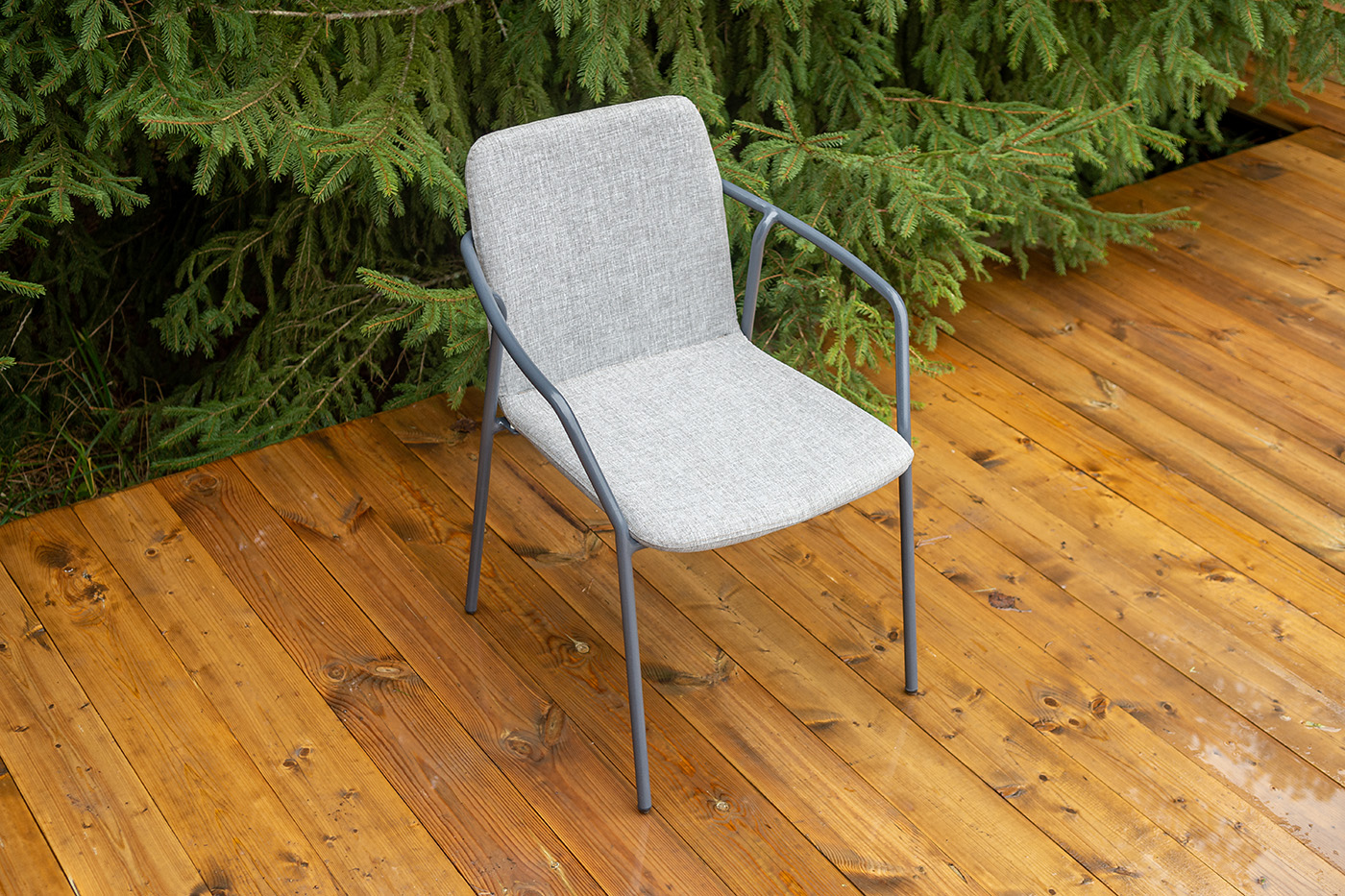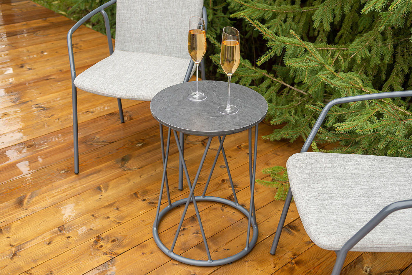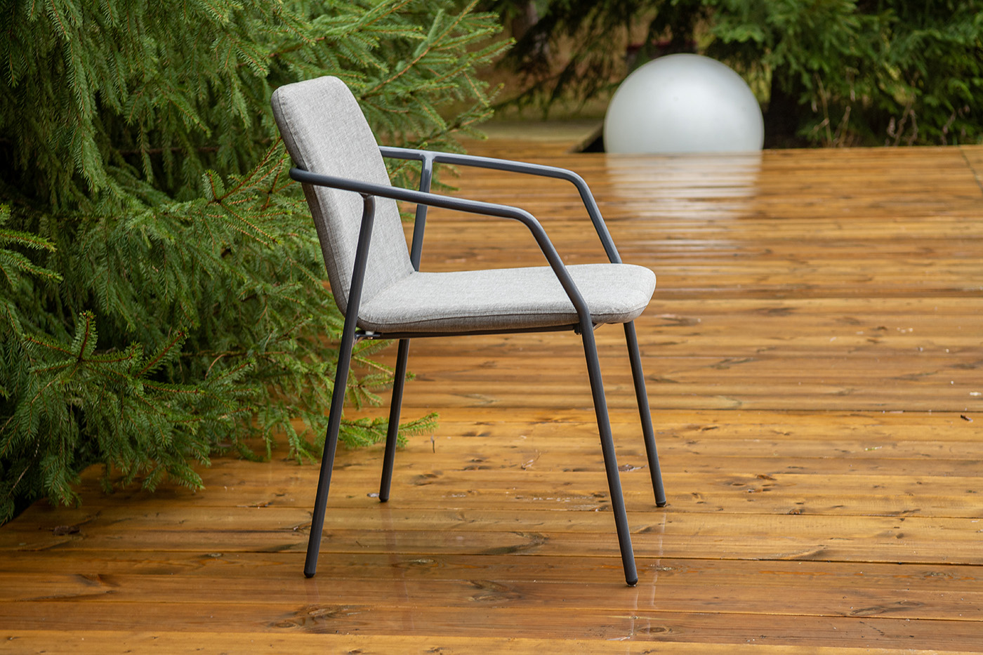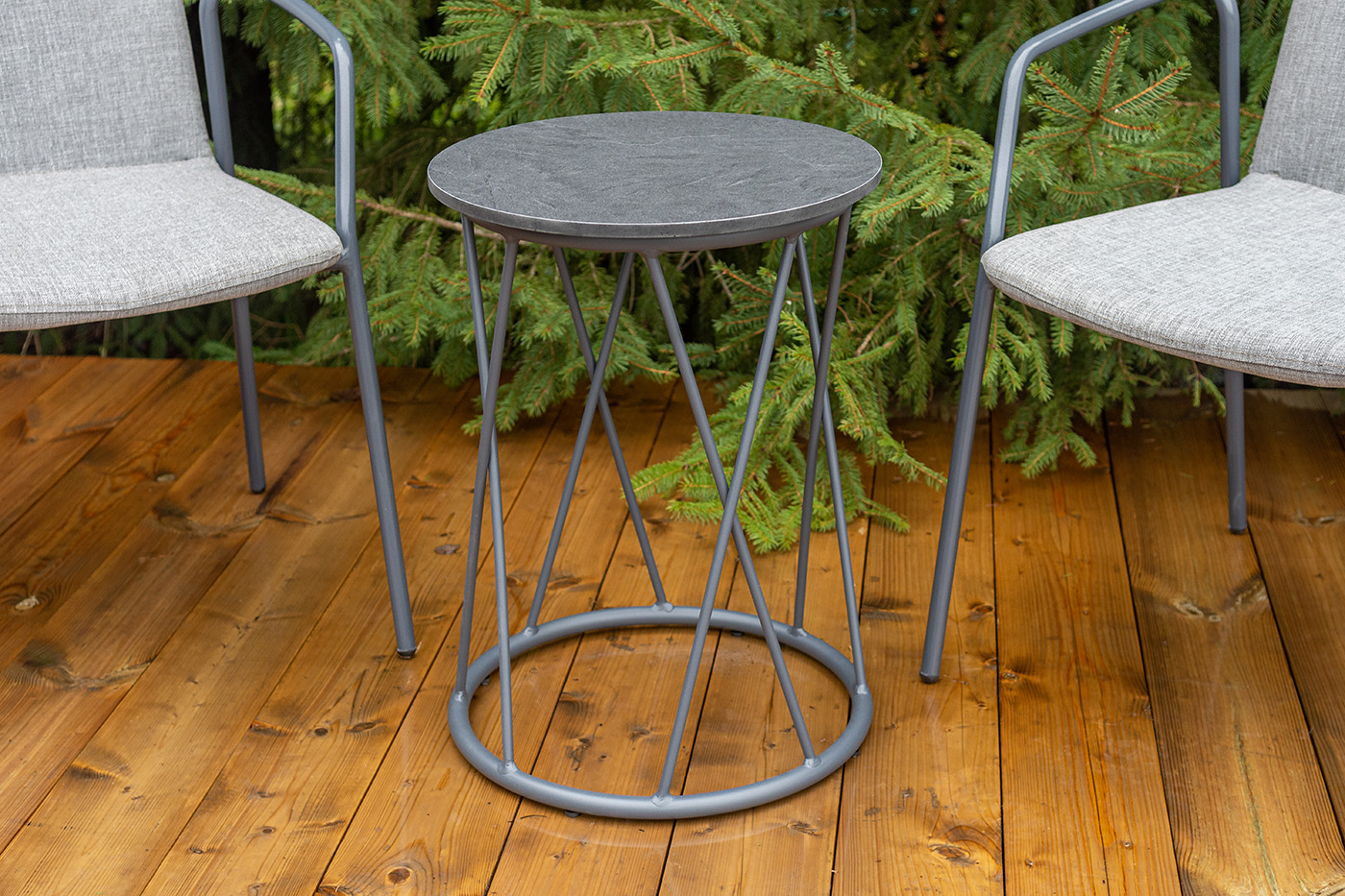 Кофейный комплект «Марокко» на две персоны — компактное и стильное решение для балкона, небольшой гостиной, террасы или другого пространства с ограниченной площадью. В комплект входят два стула «Марокко» (575×600×800 мм) из текстилена Nanotex с алюминиевым каркасом в темно‑сером цвете (RAL7024) и круглый журнальный столик «Колумбия» (400×400×550 мм) с алюминиевым каркасом и столешницей из монолитного компакт‑пластика HPL (12 мм) в оттенке «серый гранит». Мебель отличается прочностью, легкостью, устойчивостью к влаге и ультрафиолету, проста в уходе и гармонично впишется в интерьер домашней библиотеки, зимнего сада, веранды или балкона. "Марокко" стул из текстилена nanotex, каркас алюминий темно-серый (RAL7024), цвет серый 2шт. 575Х600Х800, "Колумбия" журнальный стол из HPL круглый Ø40 H55, каркас из алюминия темно-серый (RAL 7024), цвет столешницы "серый гранит" 1шт. 400Х400Х550,