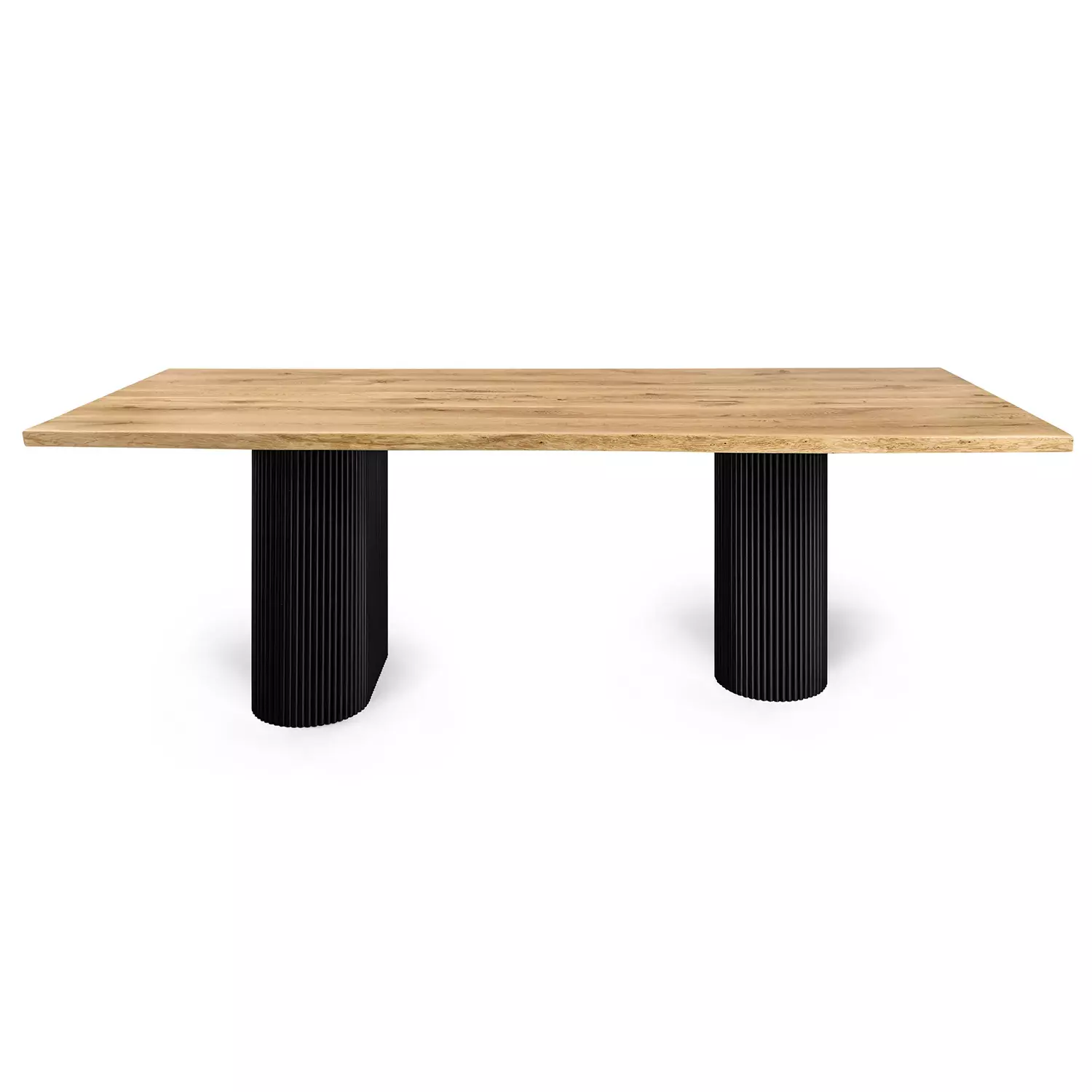 Стильный и практичный стол Snorri Sl со столешницей из дубового цельноламельного щита с природным краем , покрытого бесцветным лаком, на металлических опорах чёрного цвета.