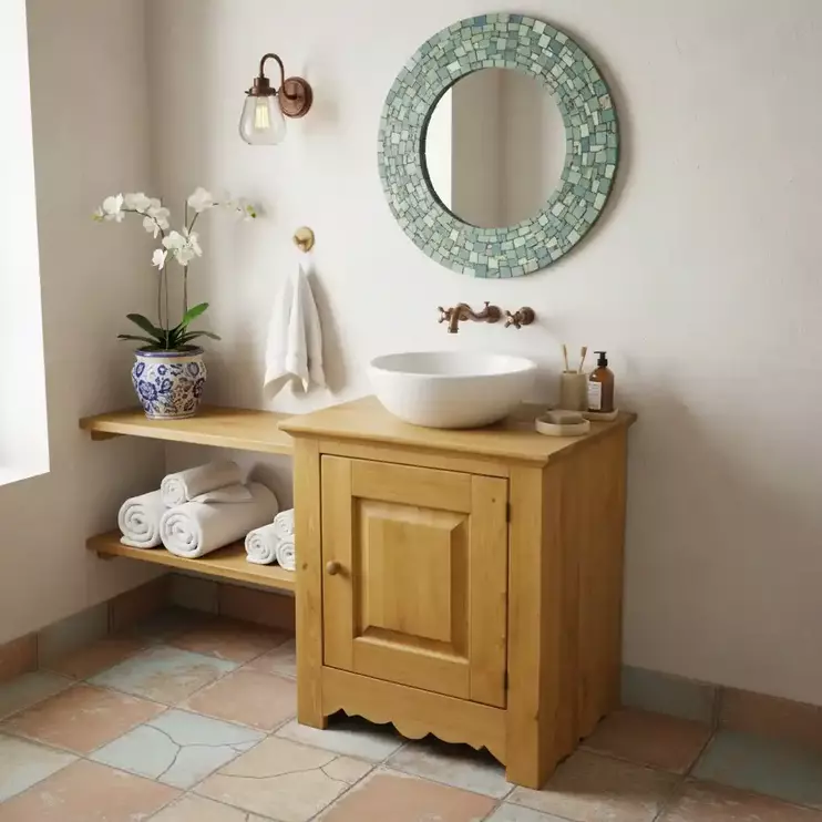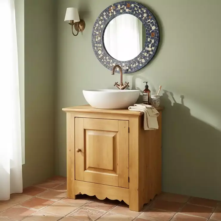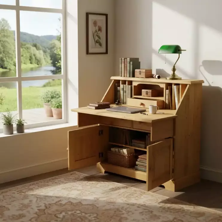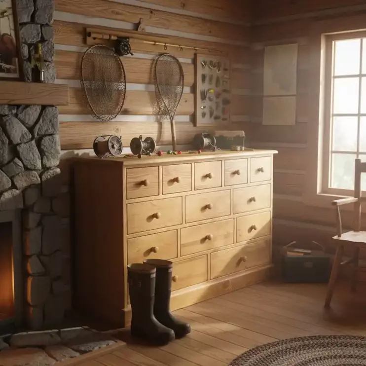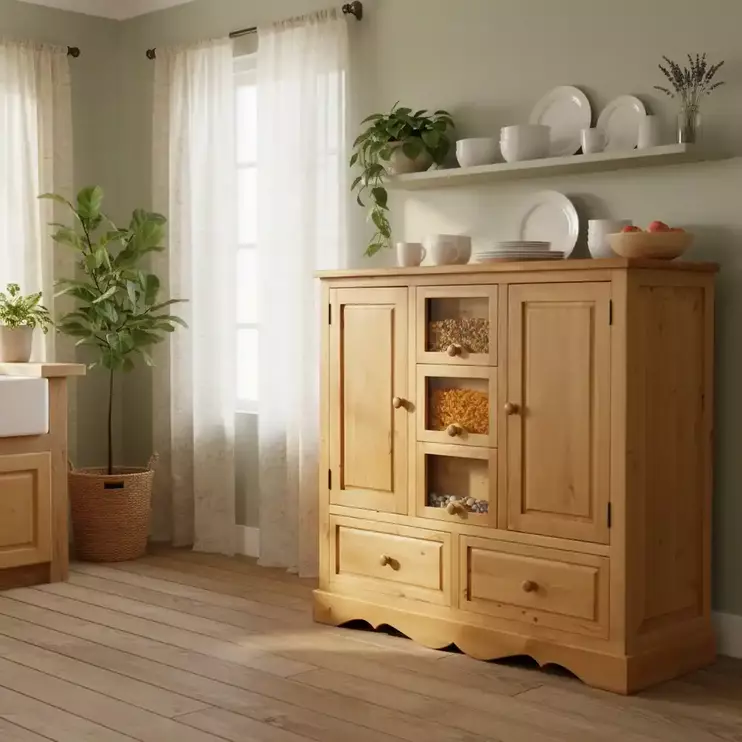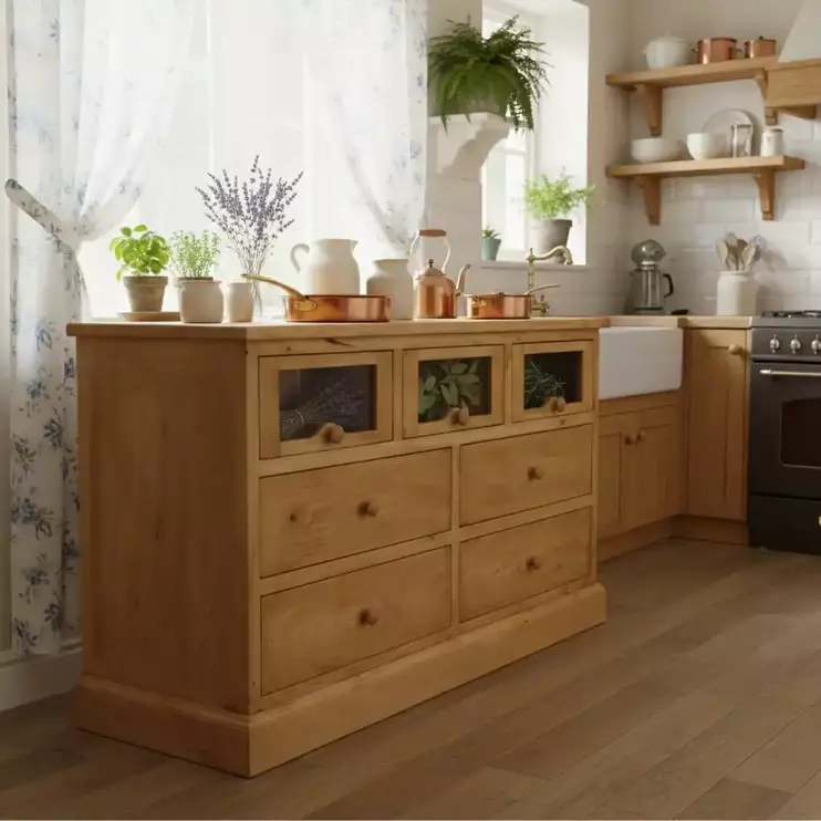Стандартная отделка – вощение древесины для получения эффекта состаривания. По запросу можно окрасить изделие в выбранный цвет по таблице RAL. Ящики выдвигаются и задвигаются без направляющих. В комплект входят деревянные ручки для дверей и ящиков.