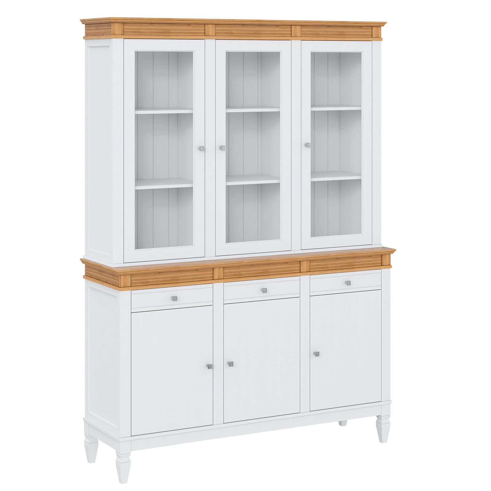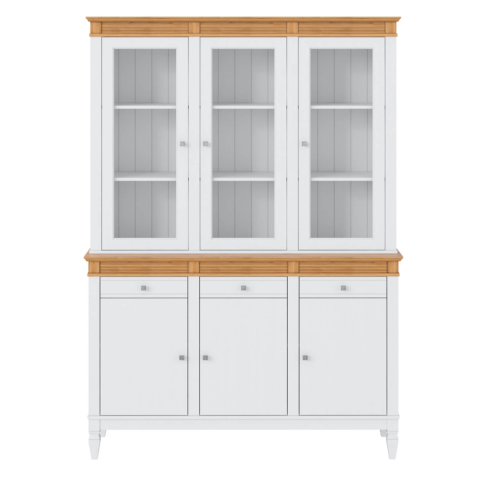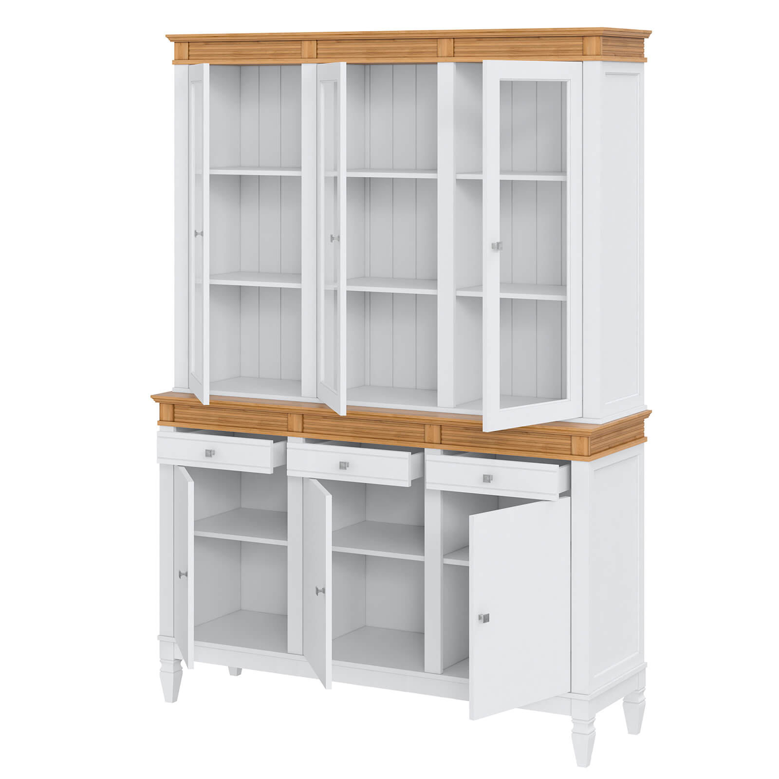 Буфет визуально разделен на 3 секции которые укомплектованы шестью полками сверху за тремя стеклянными дверями,