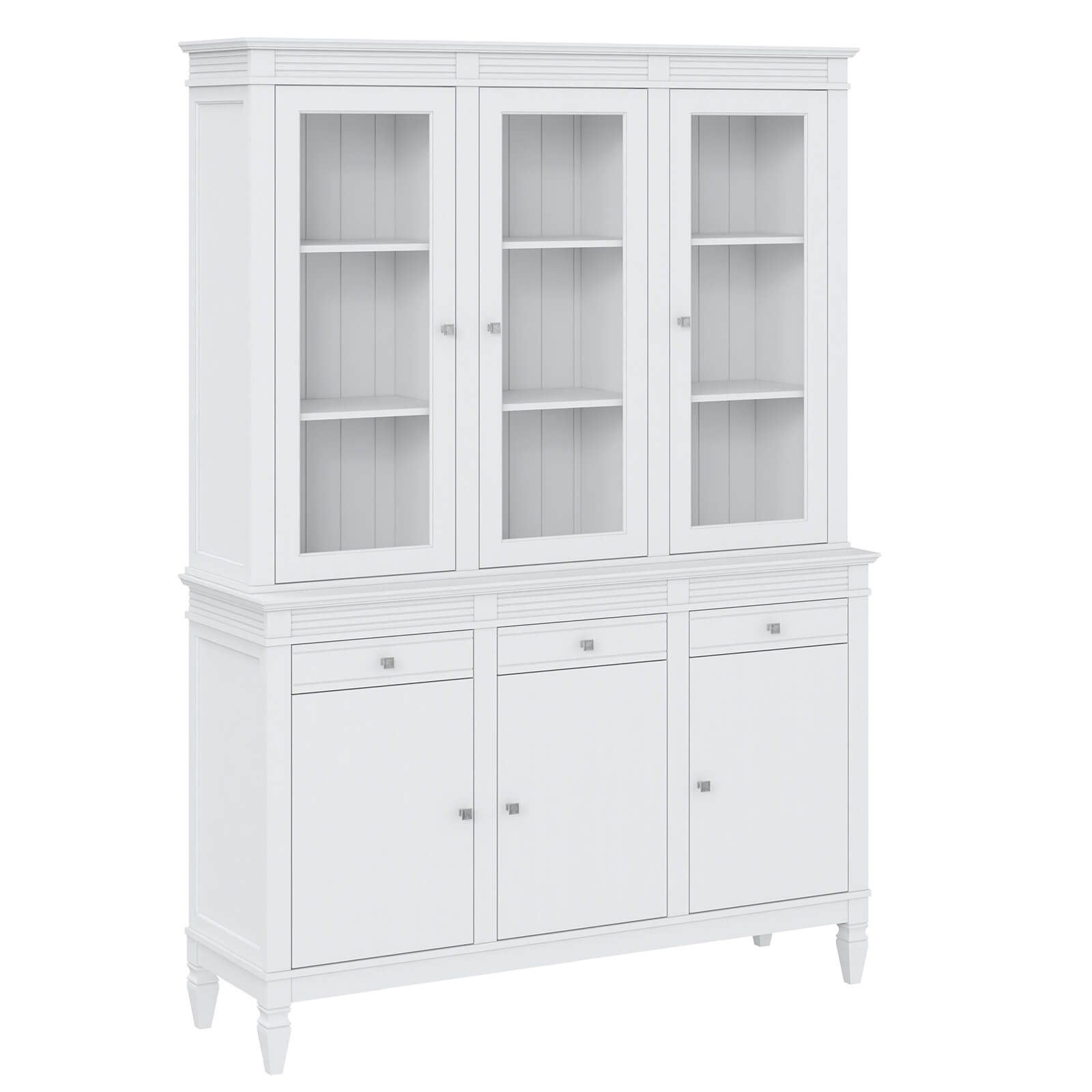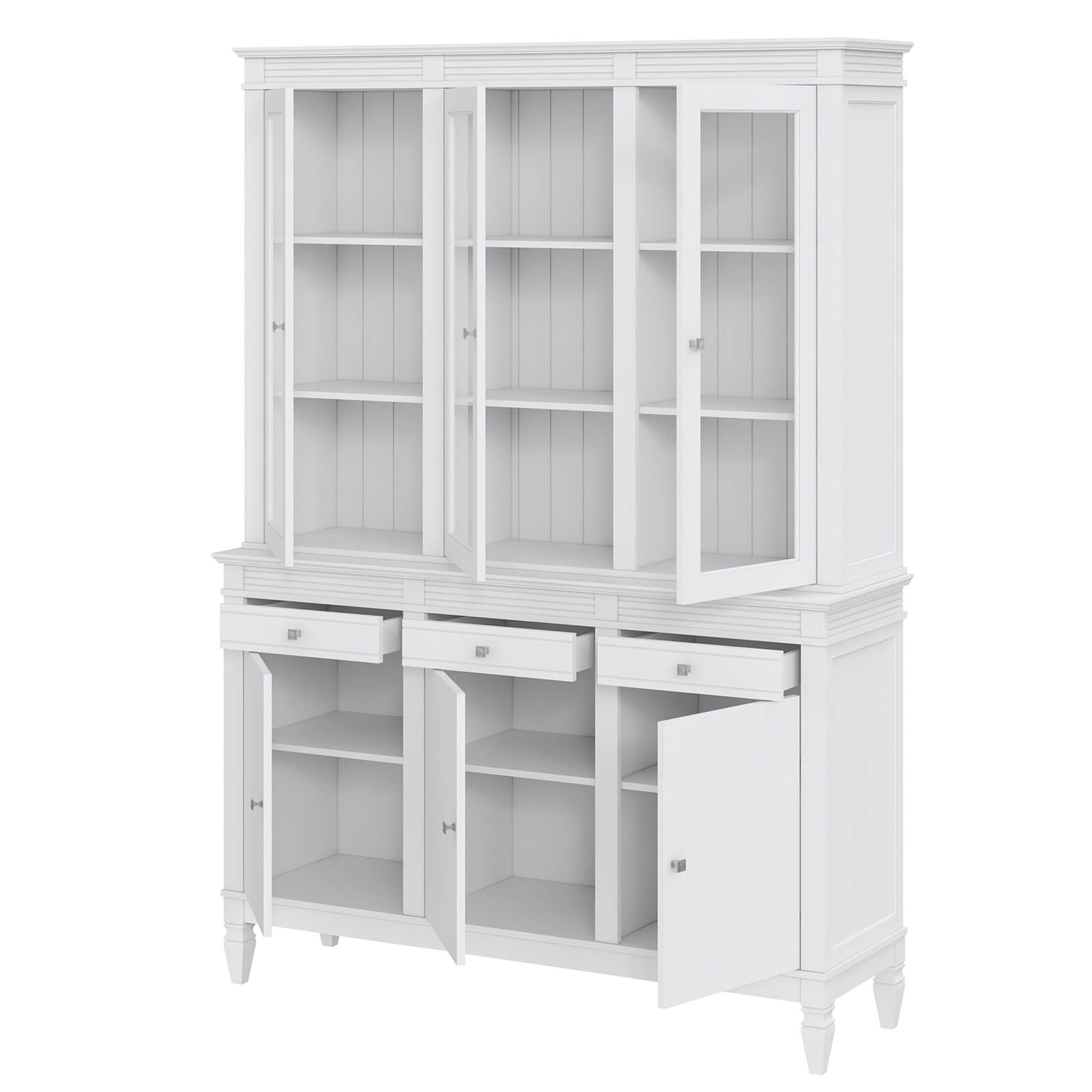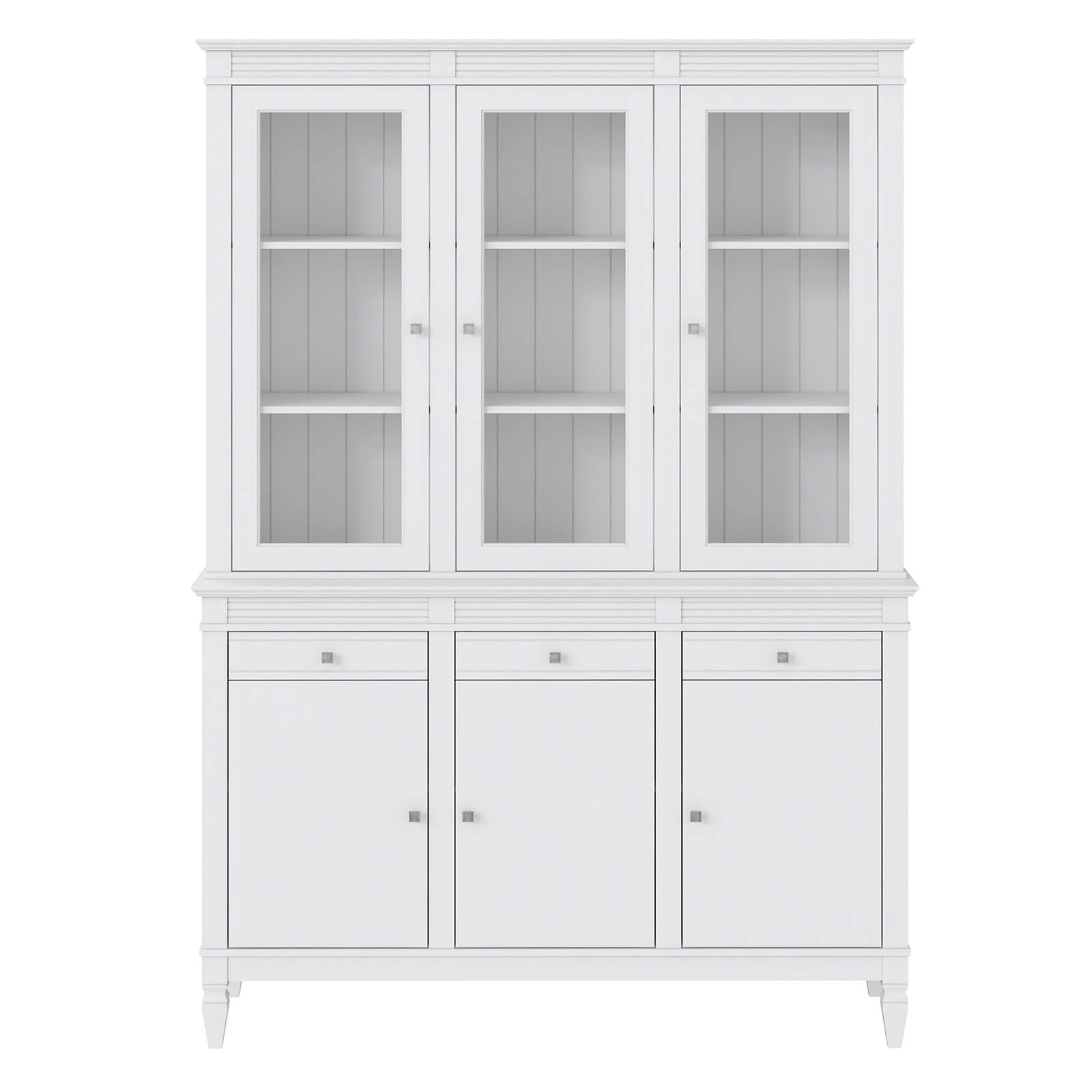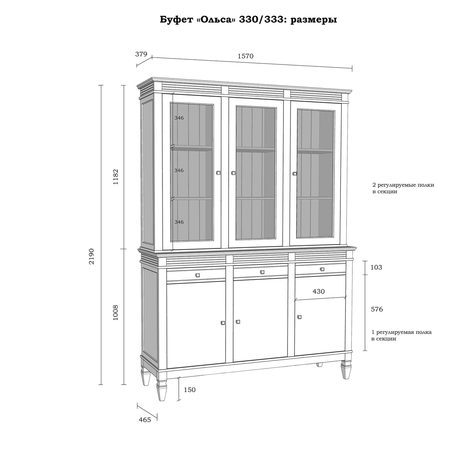 Буфет визуально разделен на 3 секции которые укомплектованы шестью полками сверху за тремя стеклянными дверями,