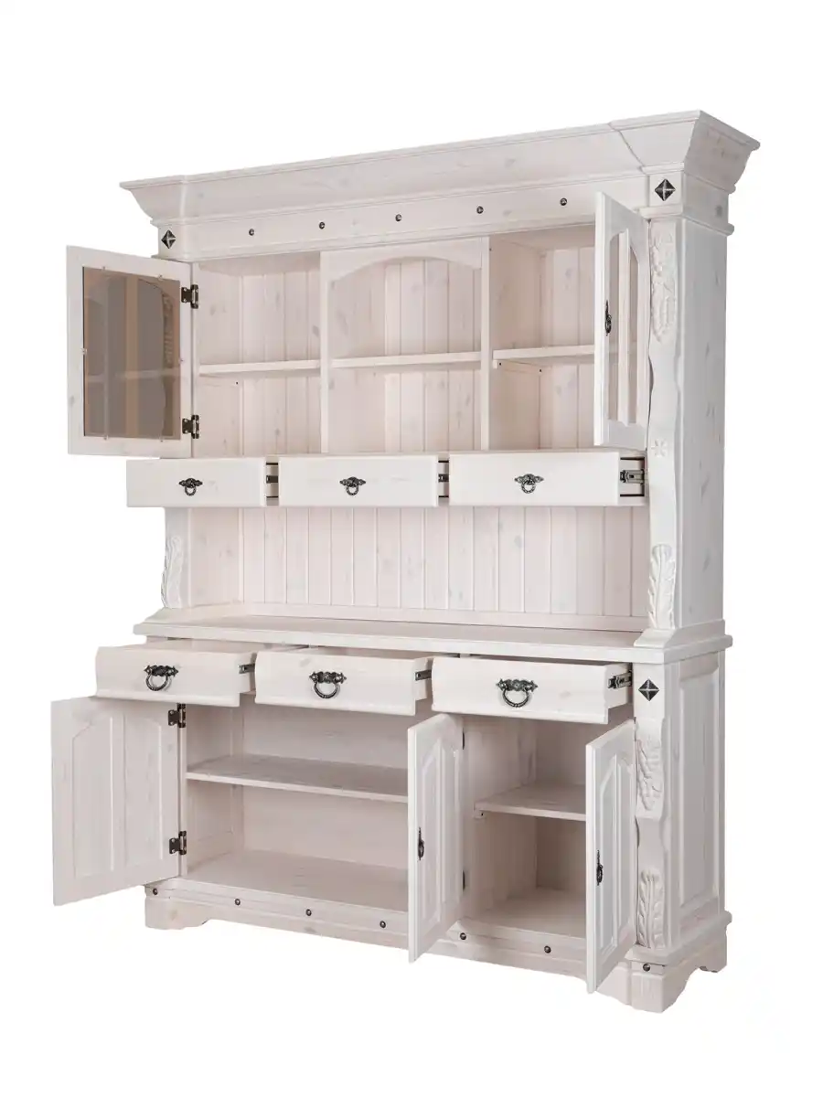 - Продуманная конструкция: Буфет поставляется в собранном виде и состоит из двух независимых модулей (верх и низ). Это значительно упрощает доставку и подъем мебели на этаж. Вам не нужно собирать корпус — для установки достаточно просто поставить верхнюю витрину на нижнюю тумбу. Верхняя секция оснащена застекленными и открытыми полками для демонстрации красивой посуды. Нижняя часть — вместительная тумба с полками и ящиками для хранения столовых принадлежностей.