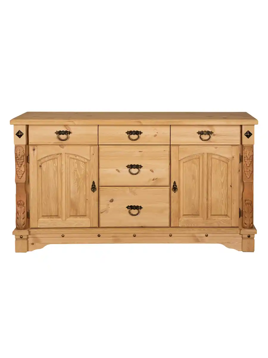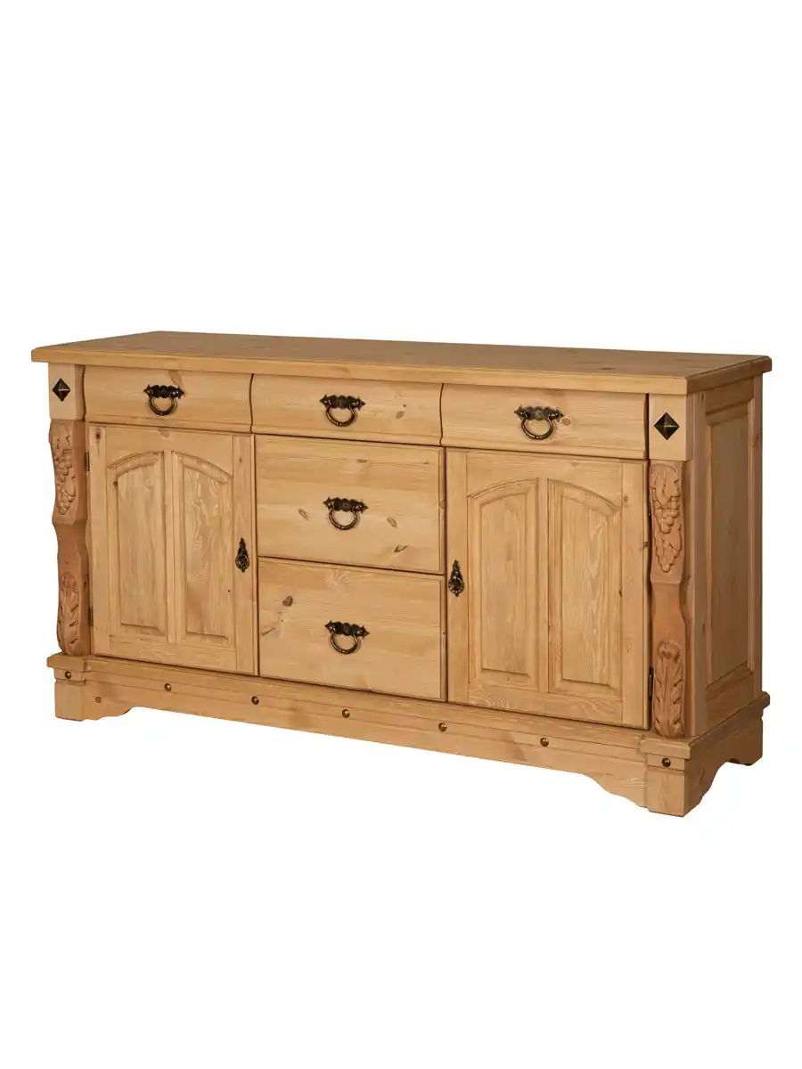 Комод «Викинг GL-05/1» — это изысканное украшение для вашей кухни или столовой. Выполненный из массива сосны, он подчеркивает аутентичный стиль загородного дома благодаря уникальным резным элементам с гроздьями винограда. Поверхность обработана натуральным воском, что придает мебели благородный матовый блеск и приятную тактильную текстуру. Оригинальный дизайн создан с помощью специально созданных потертостей, декоративных следов древоточцев и изящных вставок на фасадах, делая каждый экземпляр по-настоящему уникальным.