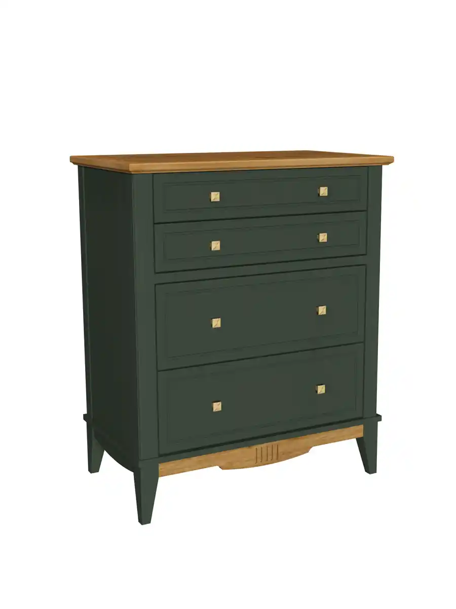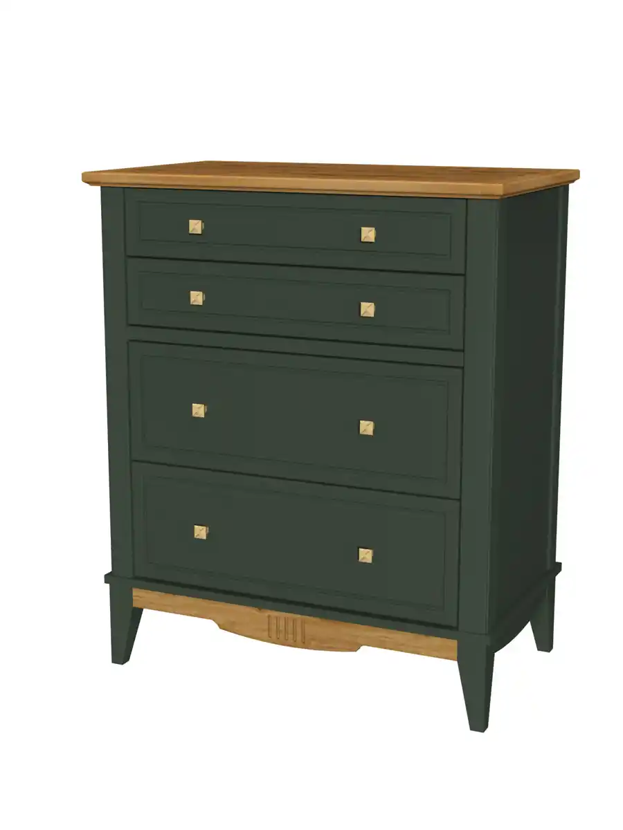 Оригинальное цветовое решение: Корпус комода выдержан в благородном зеленом тоне (RAL 6020), крышка и нижняя декоративная планка окрашены в тёплый цвет антик, через который просвечивает текстура дерева. Донья ящиков сделаны из оргалита светло - коричневого цвета под дерево, стенки ящиков окрашены в цвет корпуса.