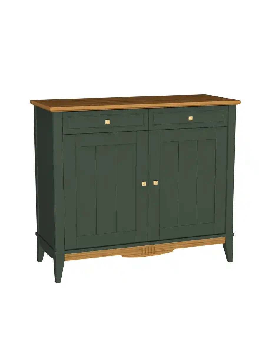 Корпус, фасады, полки и стенки ящиков комода окрашены в красивый зеленый цвет, столешница и декоративная планка – в цвет антик, через который виден природный рисунок древесины. Эта модель также доступна в отделках «белый воск/антик», «серый/антик» и «черный/антик». Красители шведской компании Becker Acroma, применяемые для отделки, проходят строгую сертификацию, безопасны для здоровья, стойкие и долговечные. Фасады и нижняя планка с фрезеровкой. Мебельные ручки-кнопки выполнены в стиле Arts & Crafts. Ручки имеет прямоугольную форму с четкими гранями и выступающей пирамидальной центральной частью. Цвет изделия – латунь.