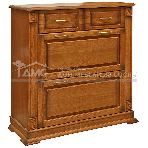 Корпуса и фасады изготавливаются из массива сосны, донья ящиков и задние стенки изделий из ДВП. Ящики устанавливаются на направляющих полного выдвижения, дверные петли оборудованы доводчиками для мягкого закрывания, без хлопков. Предметы устойчивы благодаря основаниям с низкими ножками.