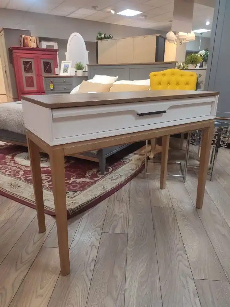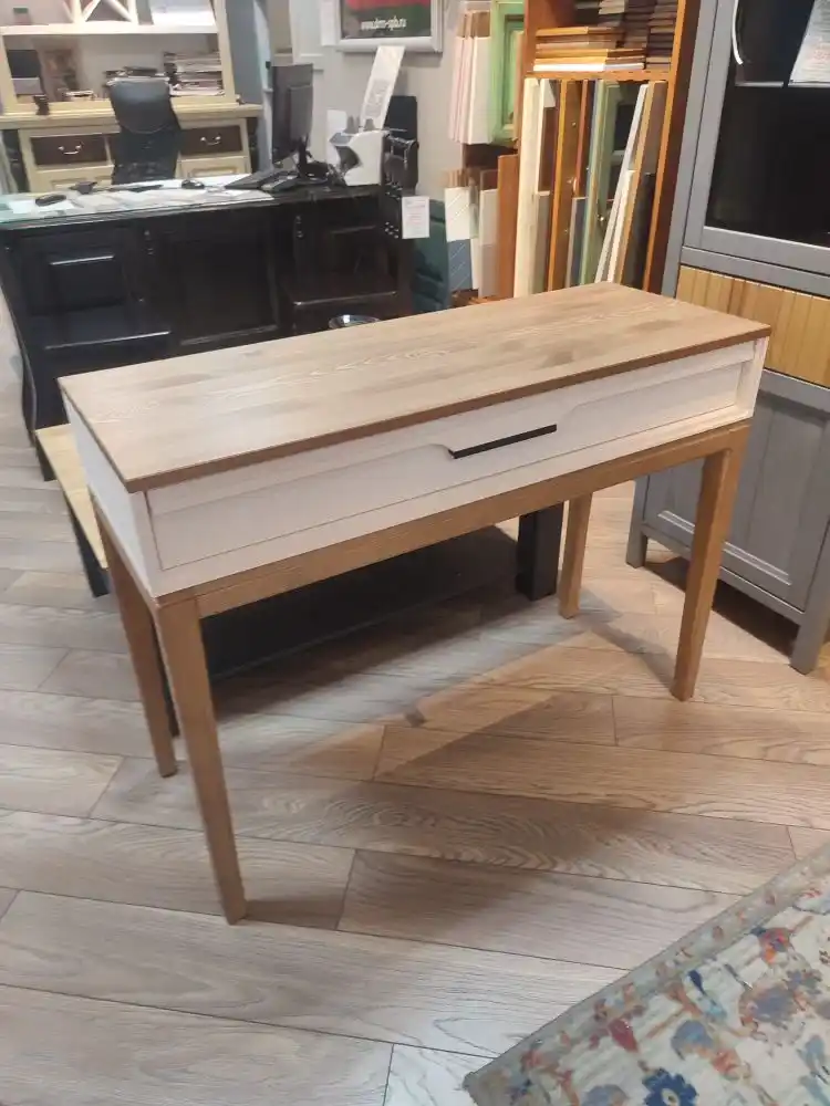 Столешница, ножки и изножье окрашены в тон «антик»., а ящик и боковины имеют оттенок белый воск. Через покрытие видна природная текстура сосны. Ящик оснащен современными направляющими с доводчиками, обеспечивающими плавное и бесшумное закрывание. На элементах конструкции присутствует декоративная фрезеровка.