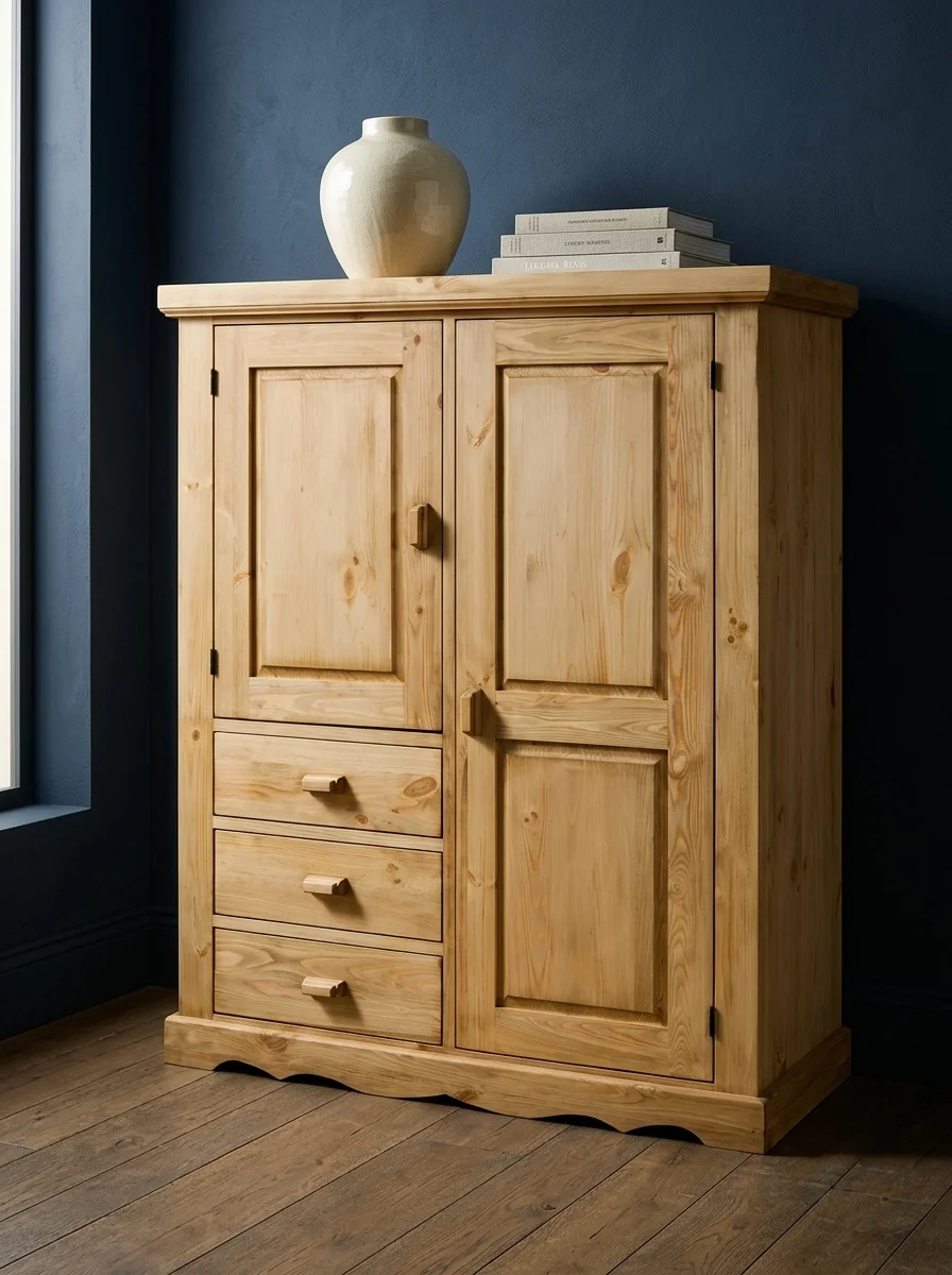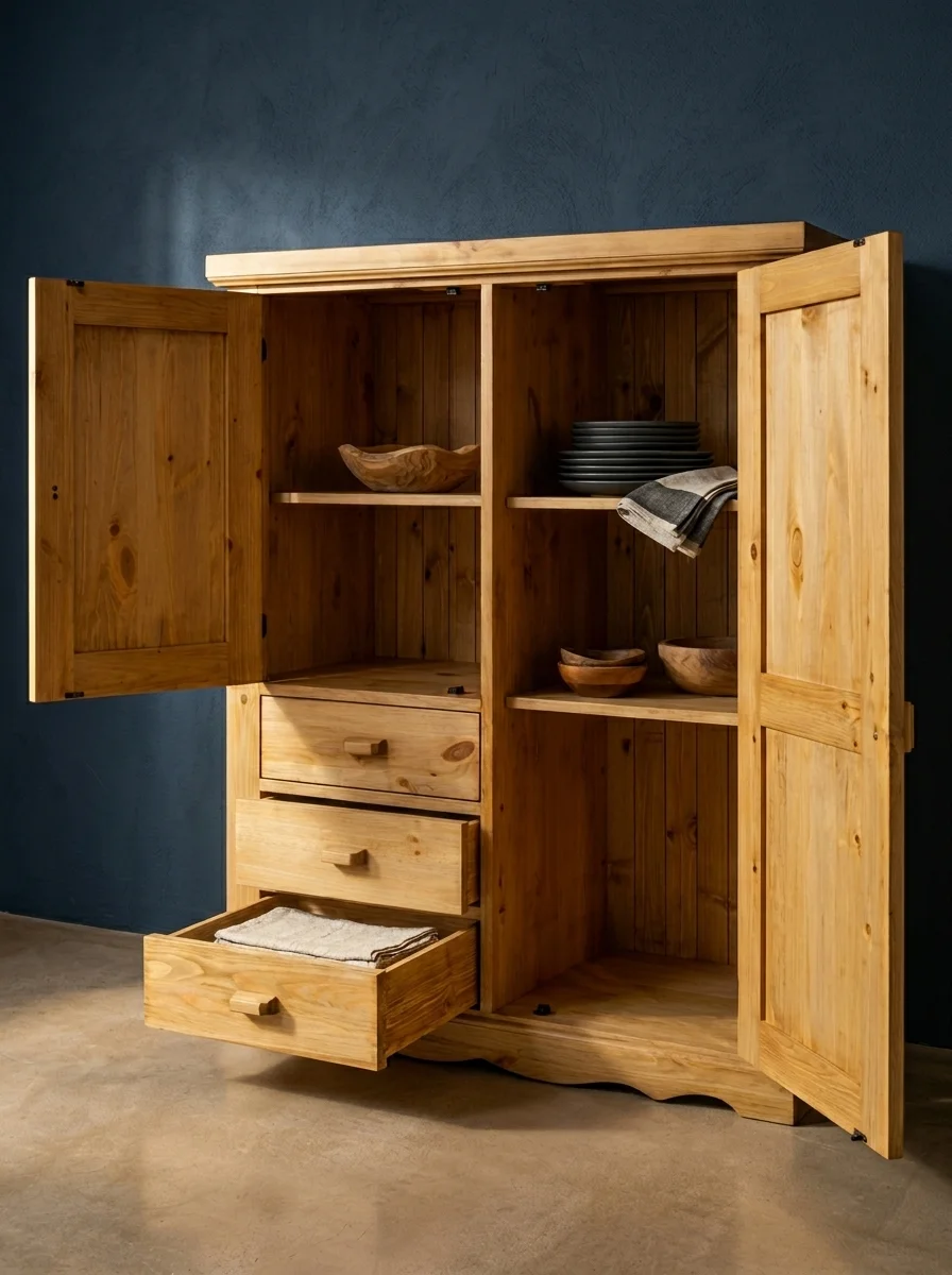 Корпус, ящики, фасады и полки изготовлены из массива сосны.
