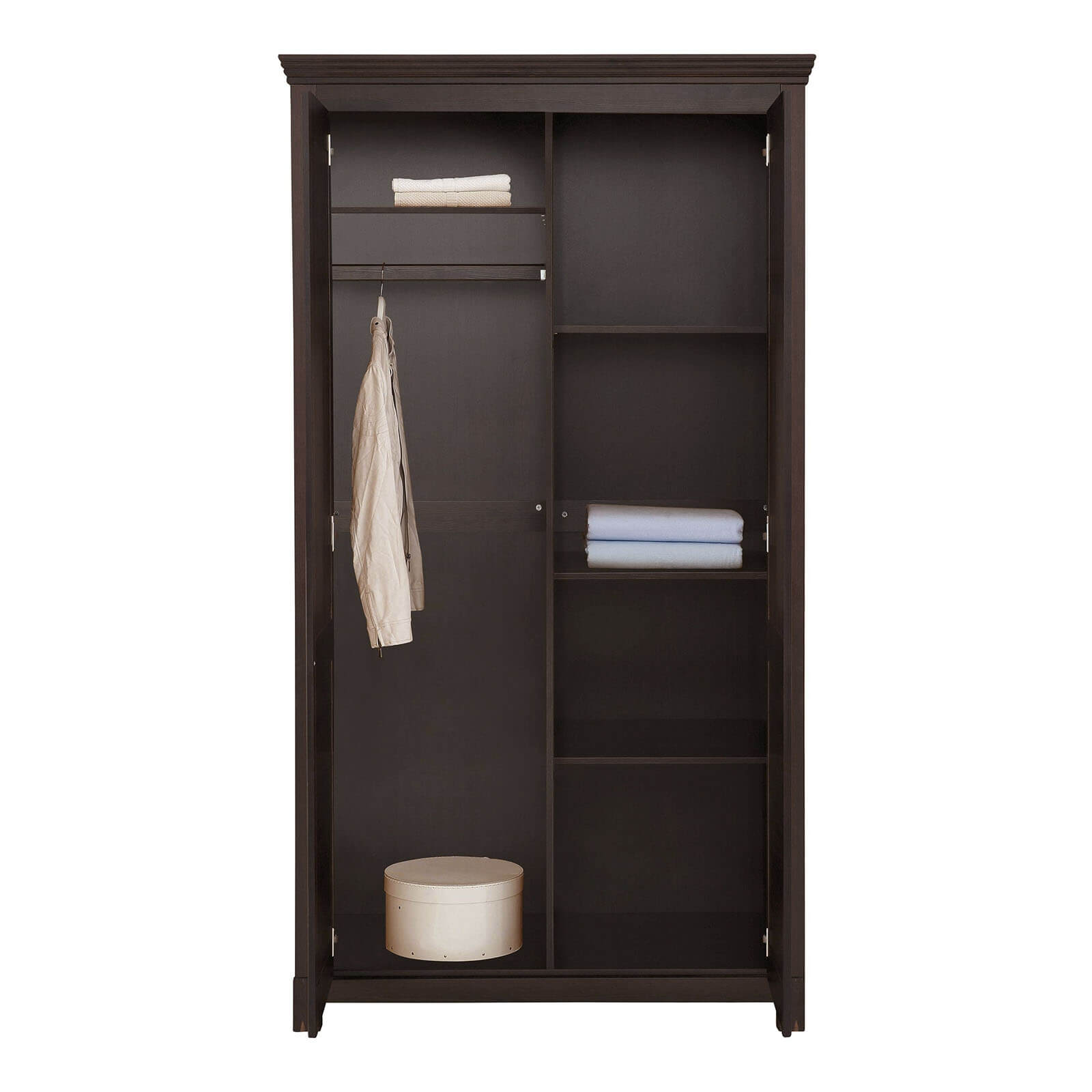 За двумя распашными дверями находятся отделение для одежды со штангой и четыре полки, где можно хранить постельное белье,