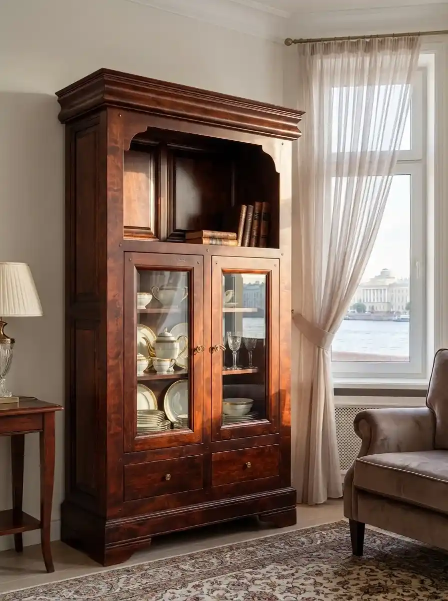 У шкафа остекленные дверцы, за которыми расположены деревянные полки. Над дверцами большая ниша с филенчатой задней стенкой. Под дверцами расположены два выдвижных ящика на деревянных направляющих. На ящиках удобные металлические ручки. Габариты шкафа 1000х380х1710 мм, вес 79 кг. Поставляется в разобранном виде, гарантийный срок 1 год. Обратите внимание, что шкаф, как и вся коллекция «Луи Филипп», делается на заказ, сроки изготовления уточняйте у наших продавцов или по телефону на сайте.