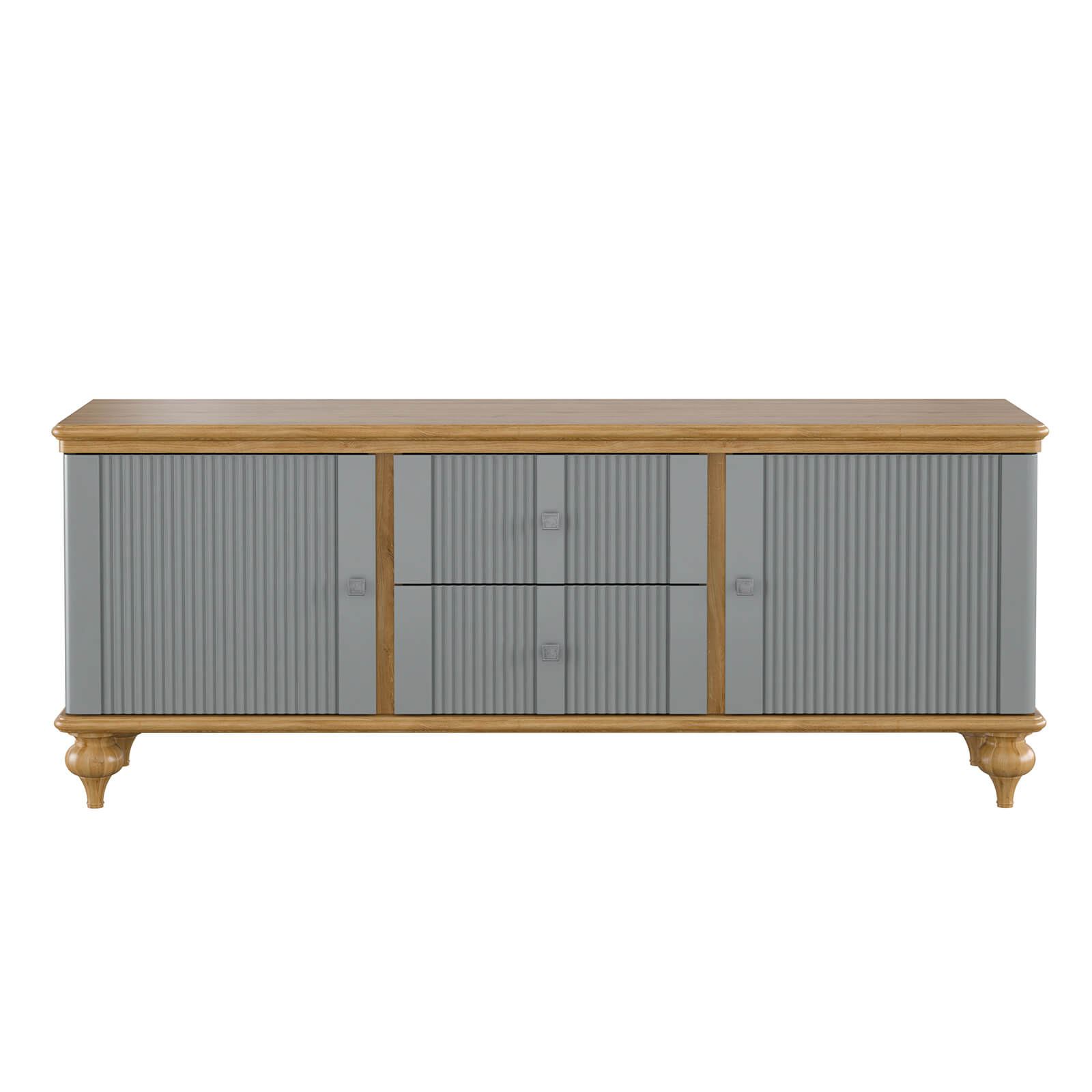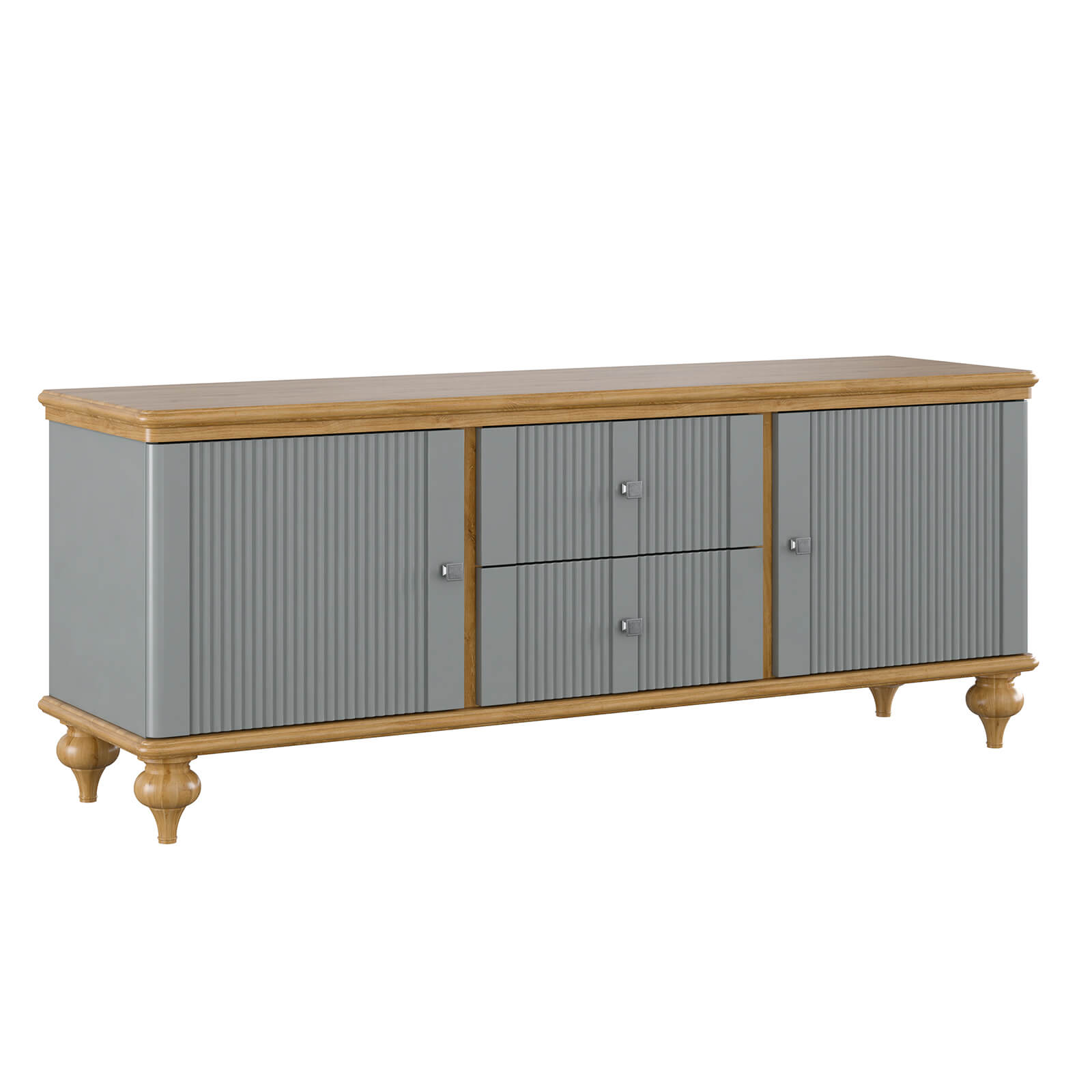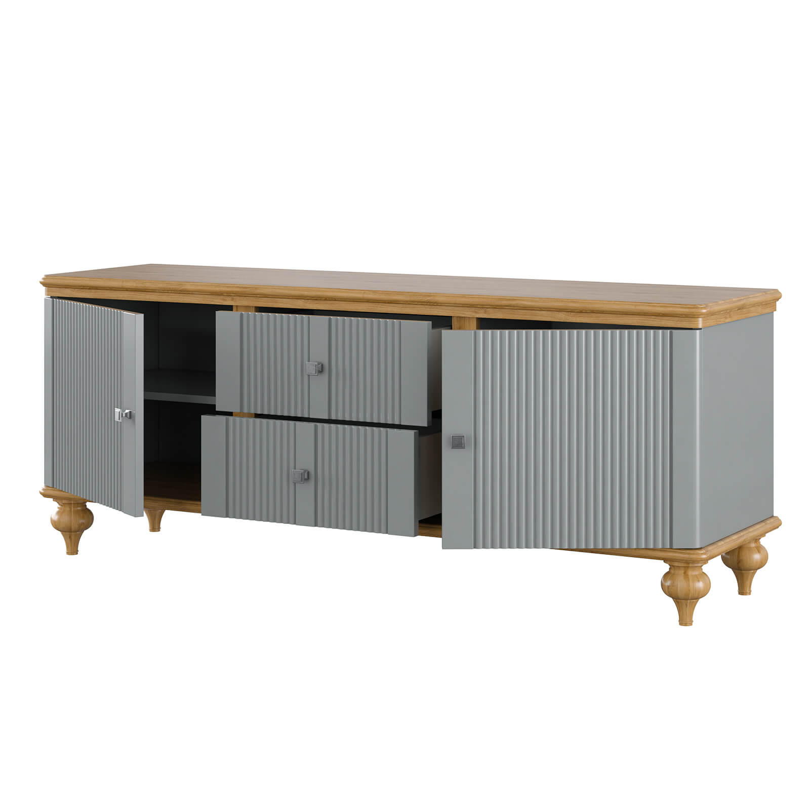 Тумба ТВ оснащена двумя выдвижными ящиками и двумя полками за распашными дверями.