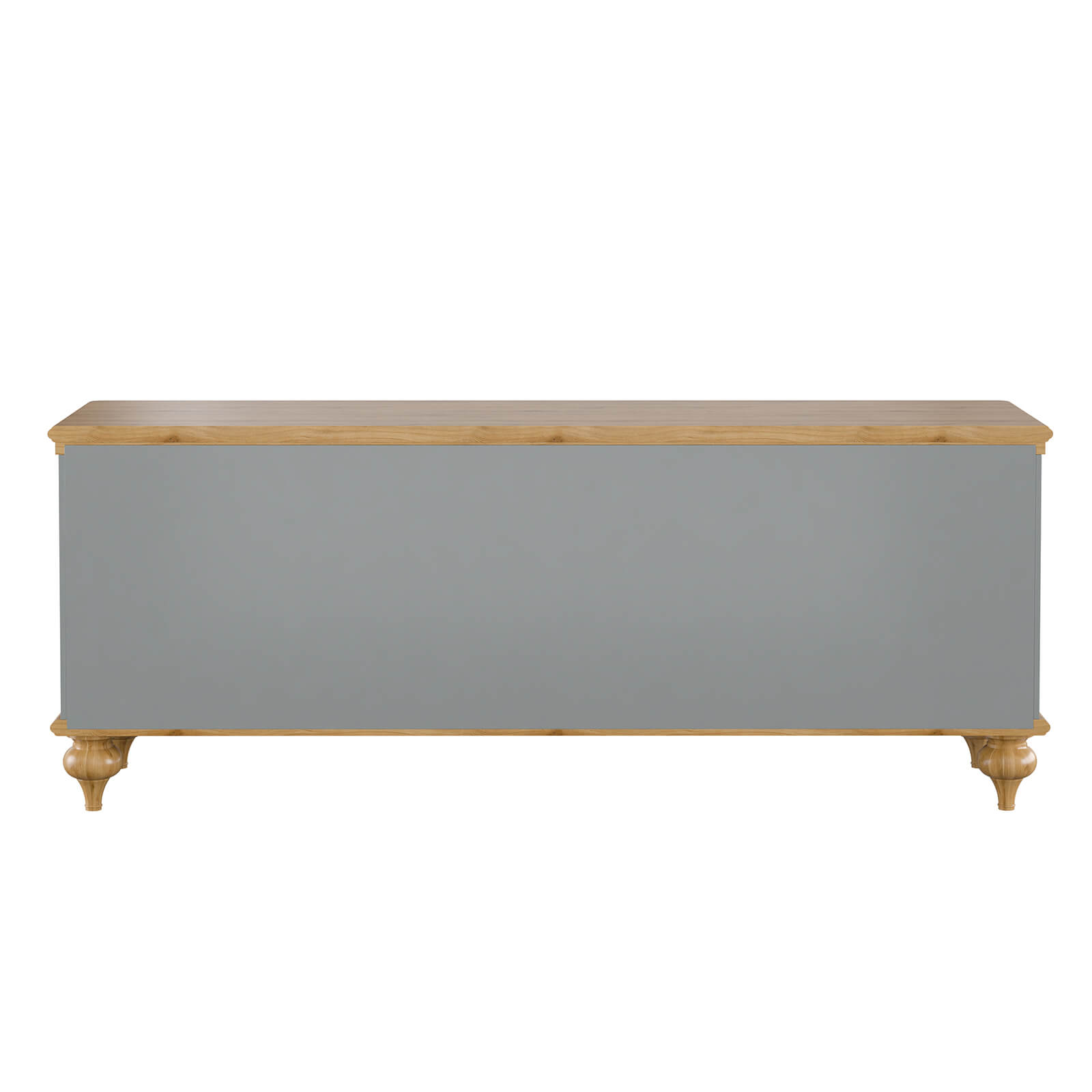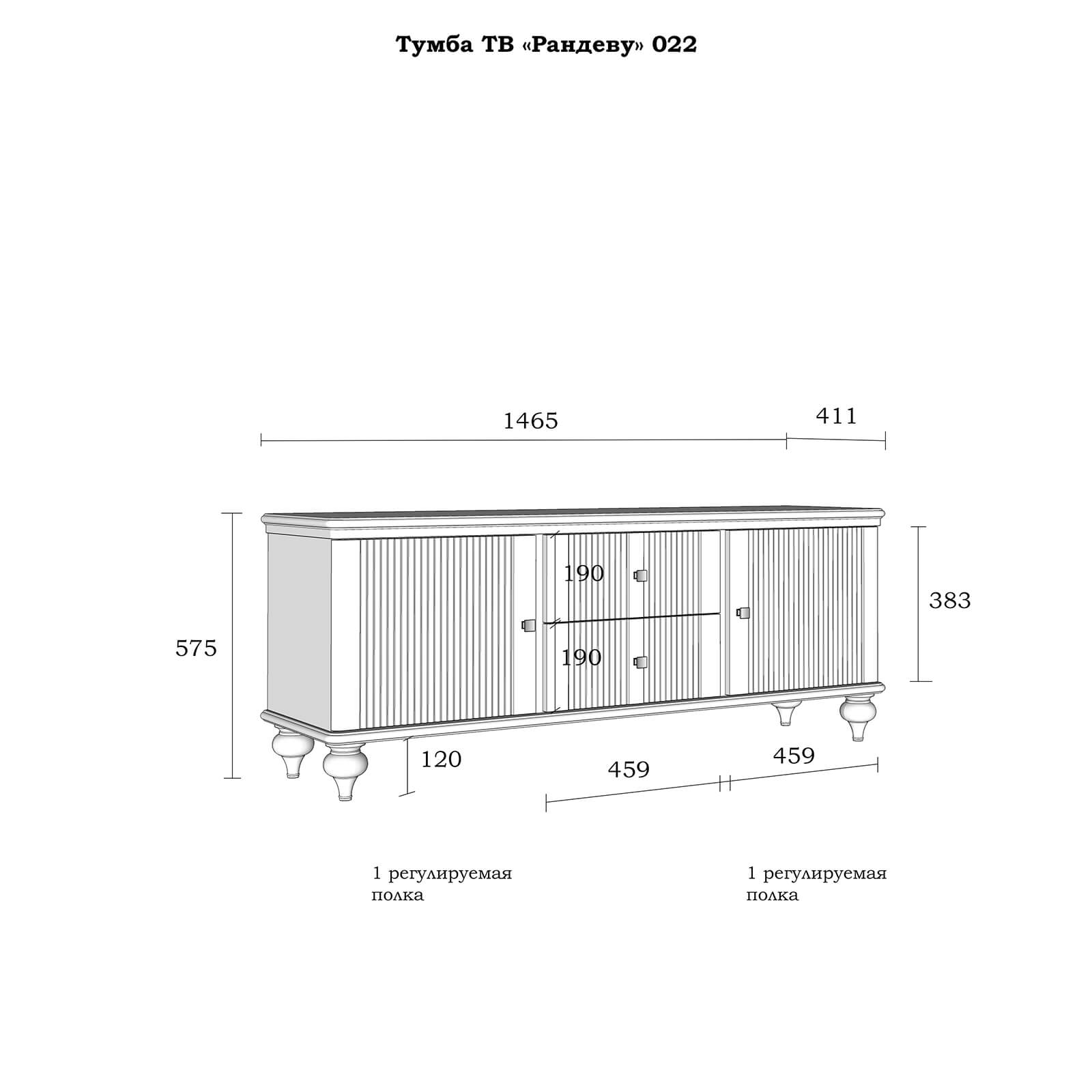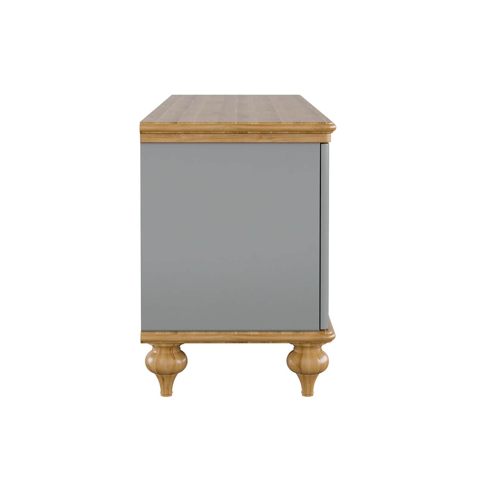 Тумба ТВ оснащена двумя выдвижными ящиками и двумя полками за распашными дверями.