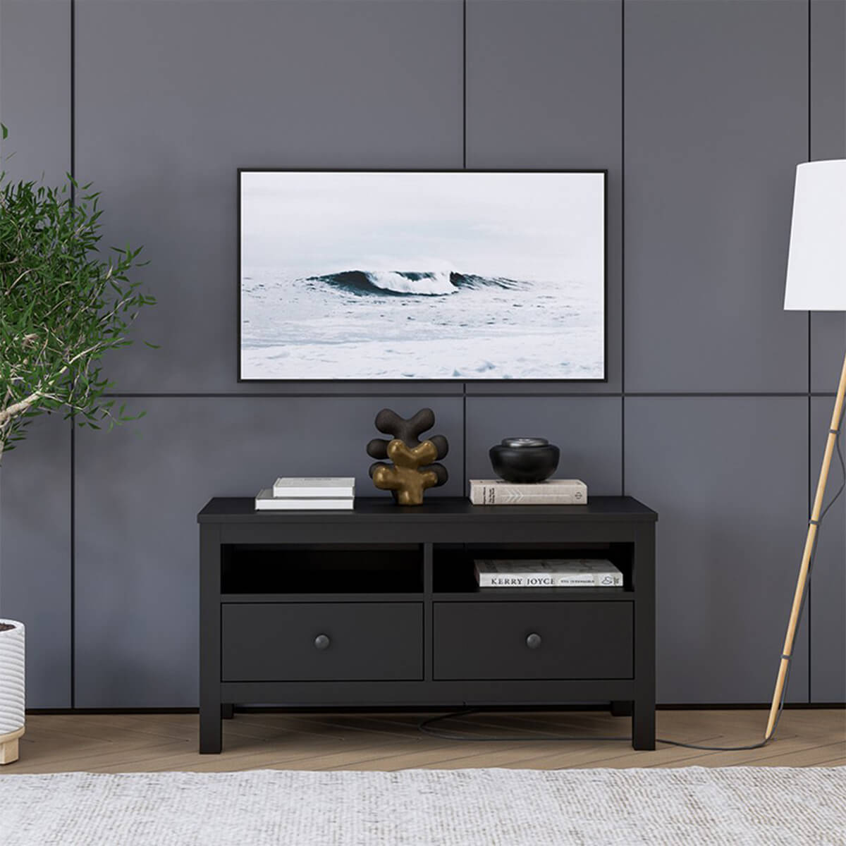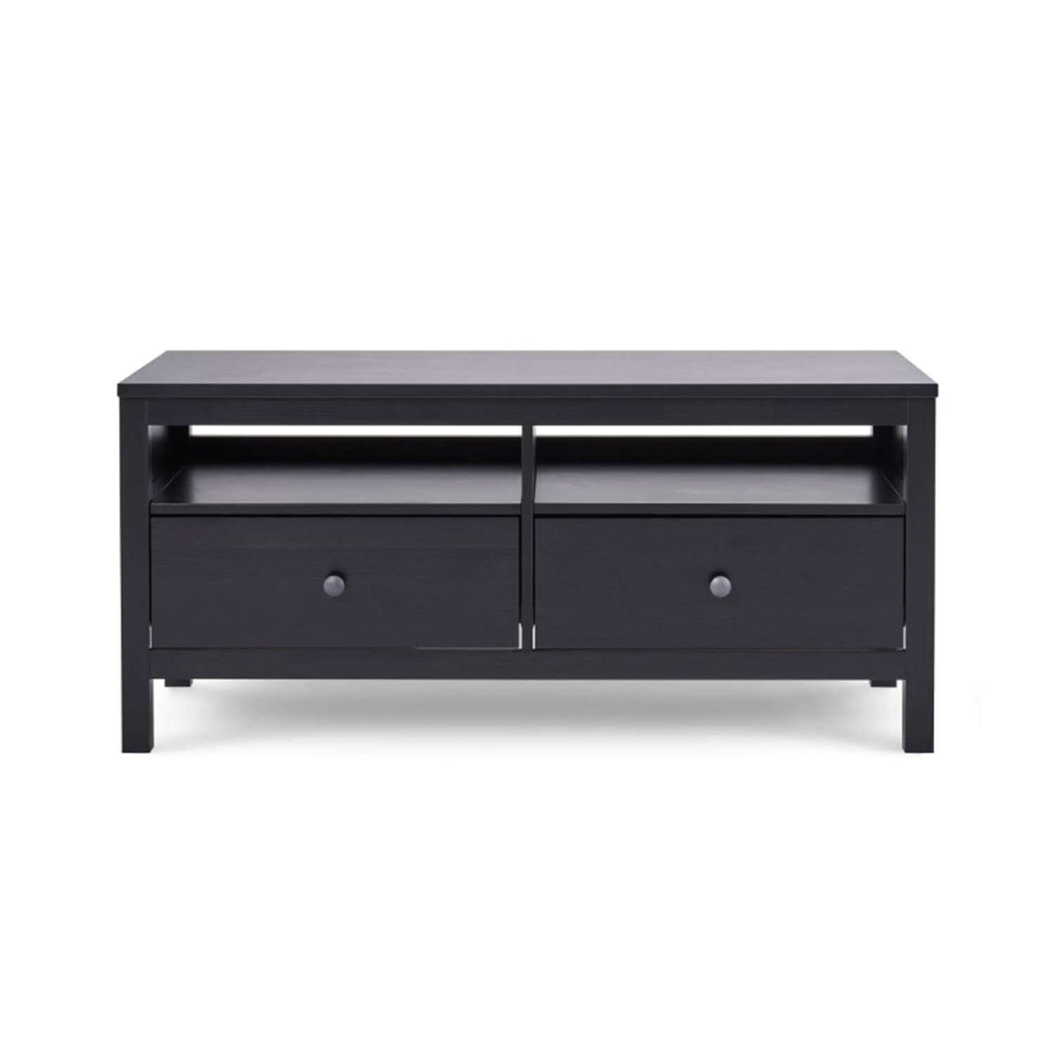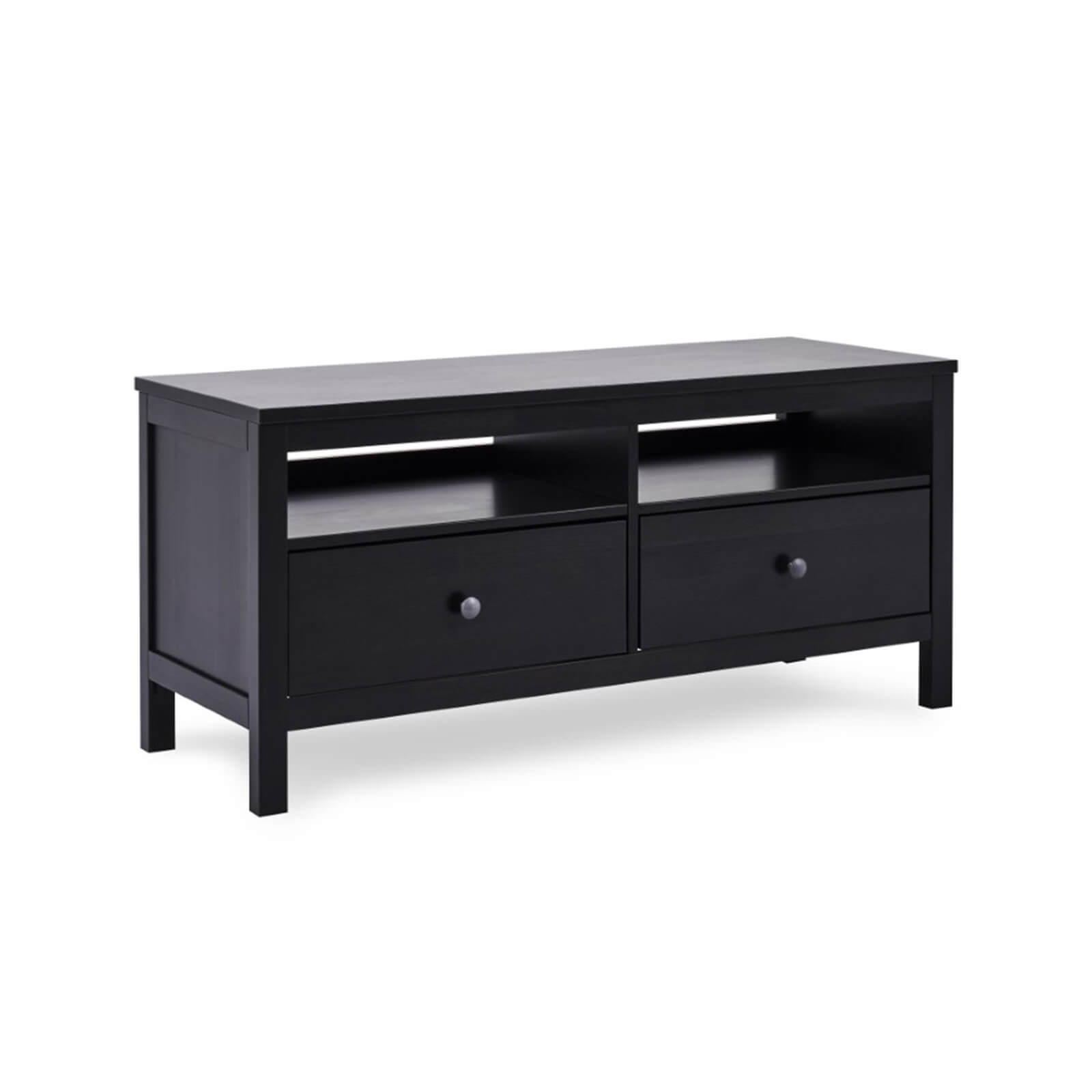 Тумба ТВ «Кантри» с 2 ящиками и 2 нишами выполнена в скандинавском стиле. Тумба компактная, подойдет для небольшой спальни или гостиной. Тумба окрашена в черный цвет. Эта же модель доступна в белом цвете. Для покрытия используются сертифицированные гипоаллергенные лаки на водной основе.