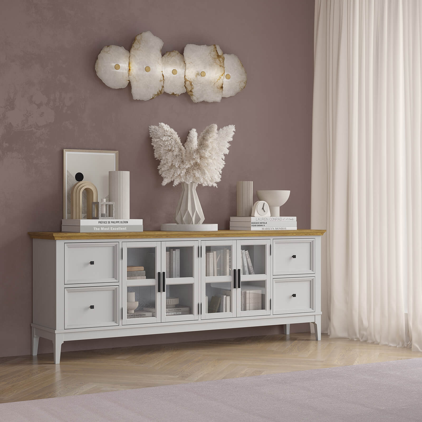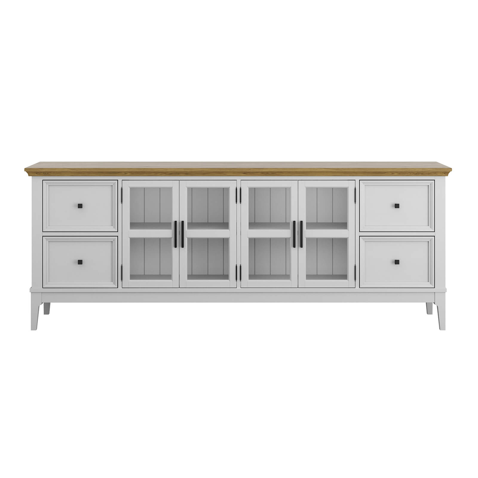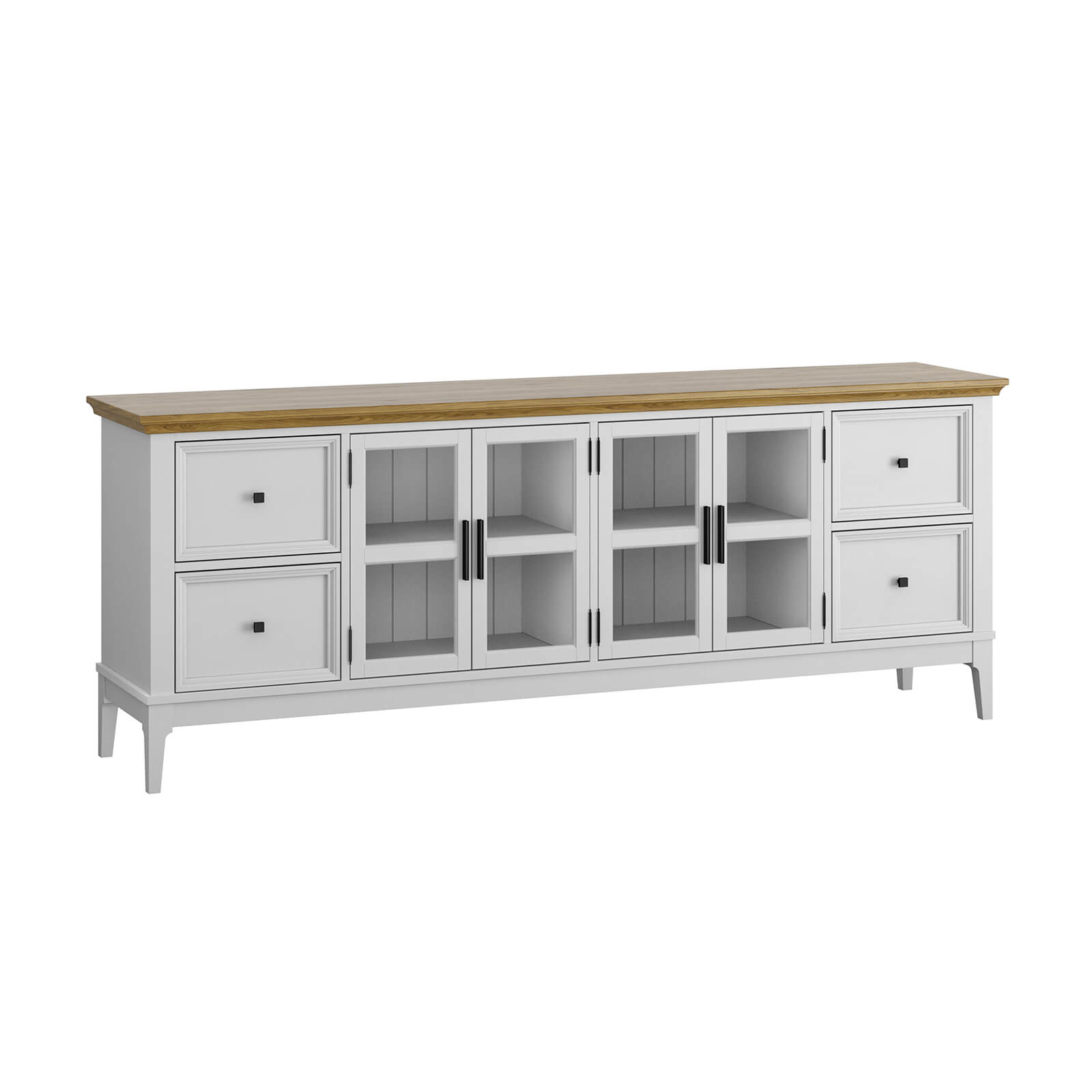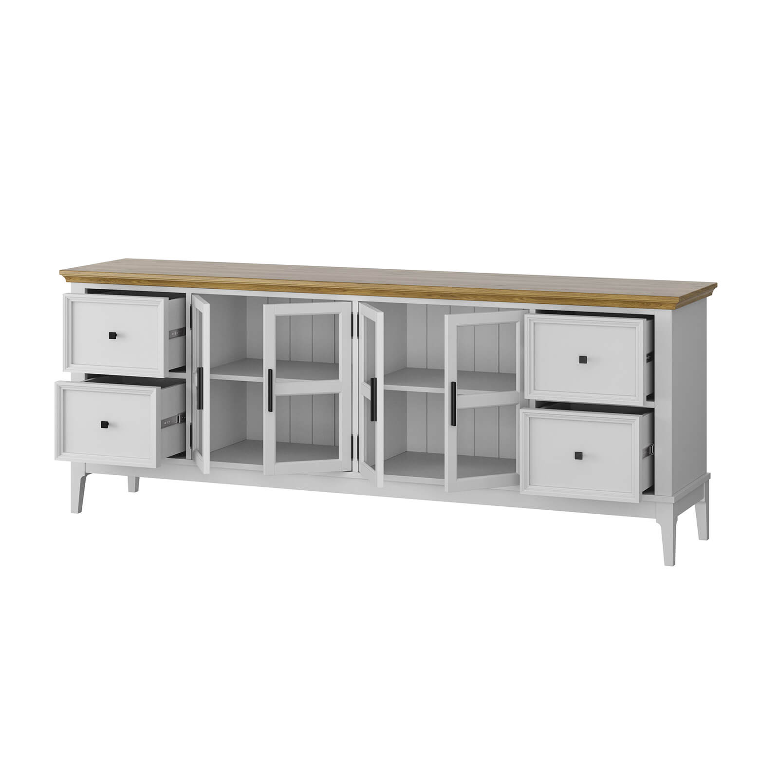 Предлагаем Вам привлекательную тумбу для ТВ «Квадро-С» 42 из массива сосны для гостиной или спальни. Тумба ТВ состоит из двух отсеков за четырьмя стеклянными дверками и четырьмя выдвижными ящиками по бокам. Внутри две широкие полки.