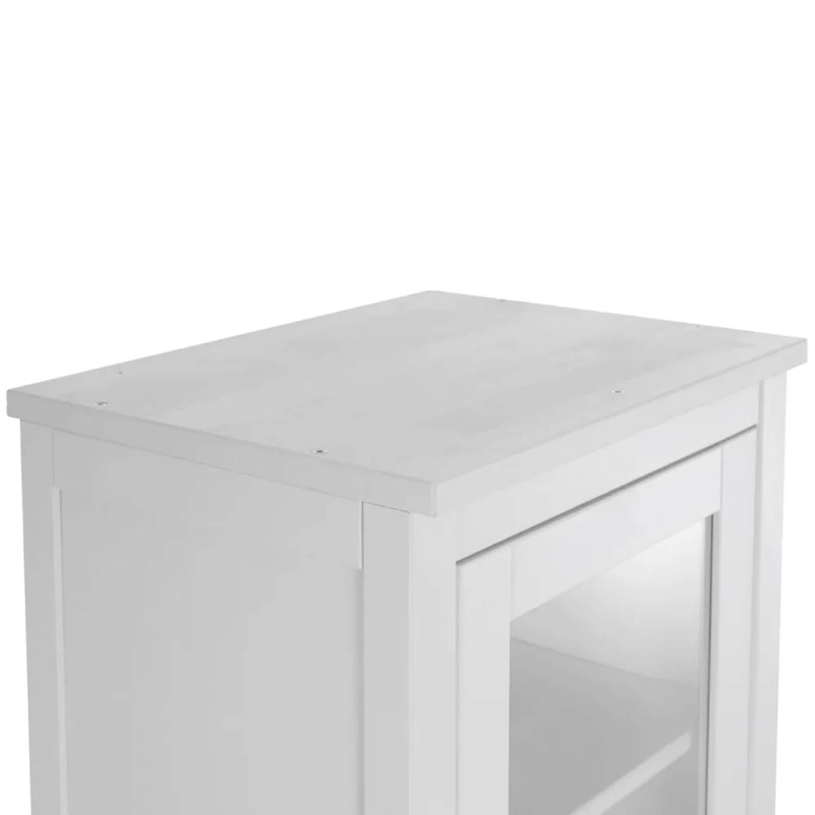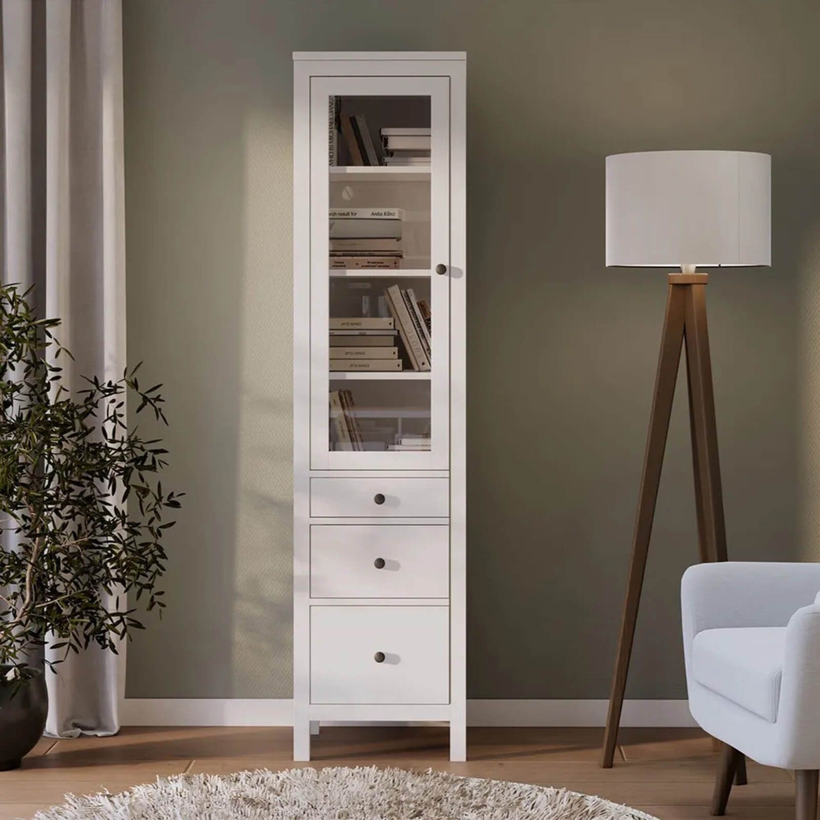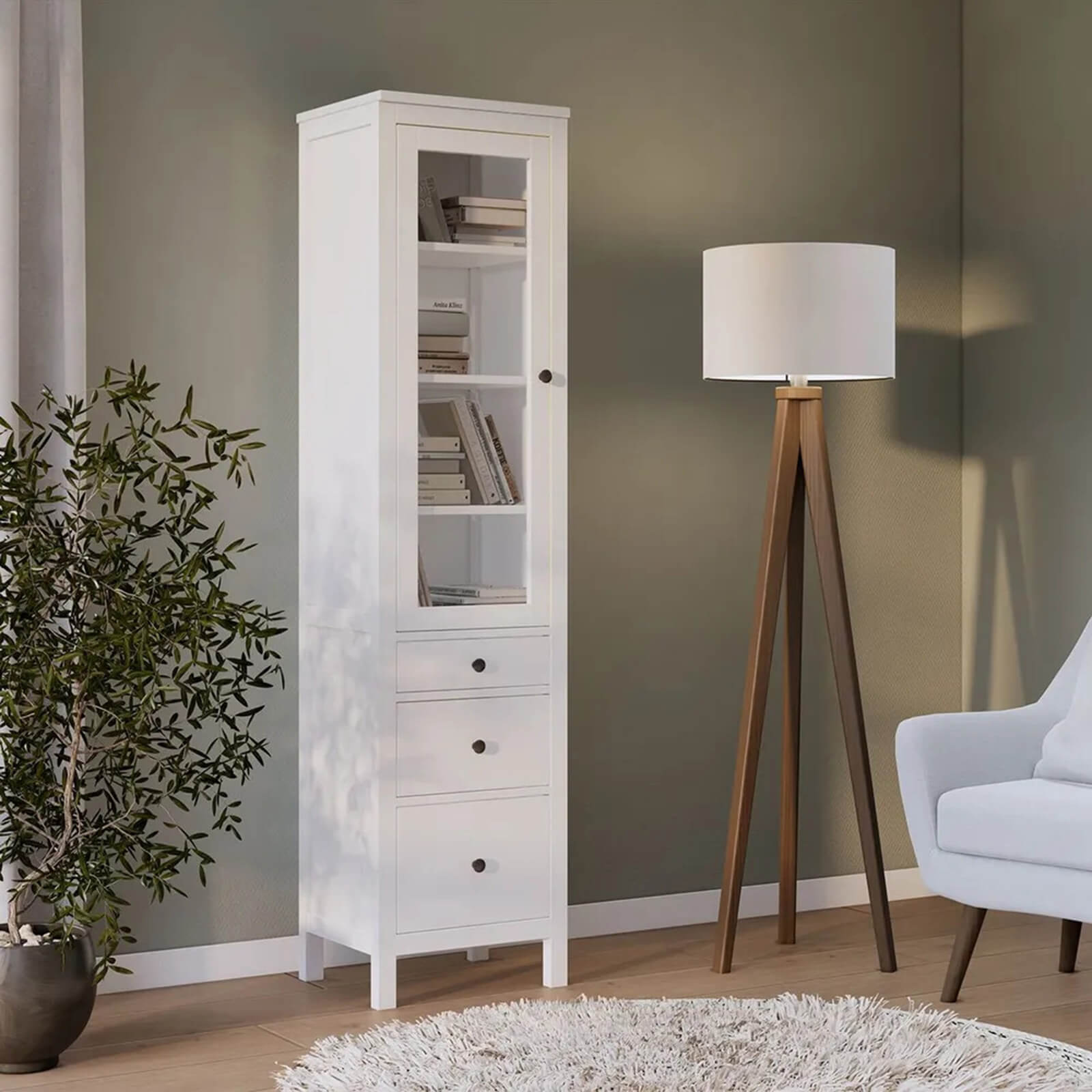 Представляет собой высокий шкаф с распашными дверями со стеклом и тремя выдвижными ящиками.