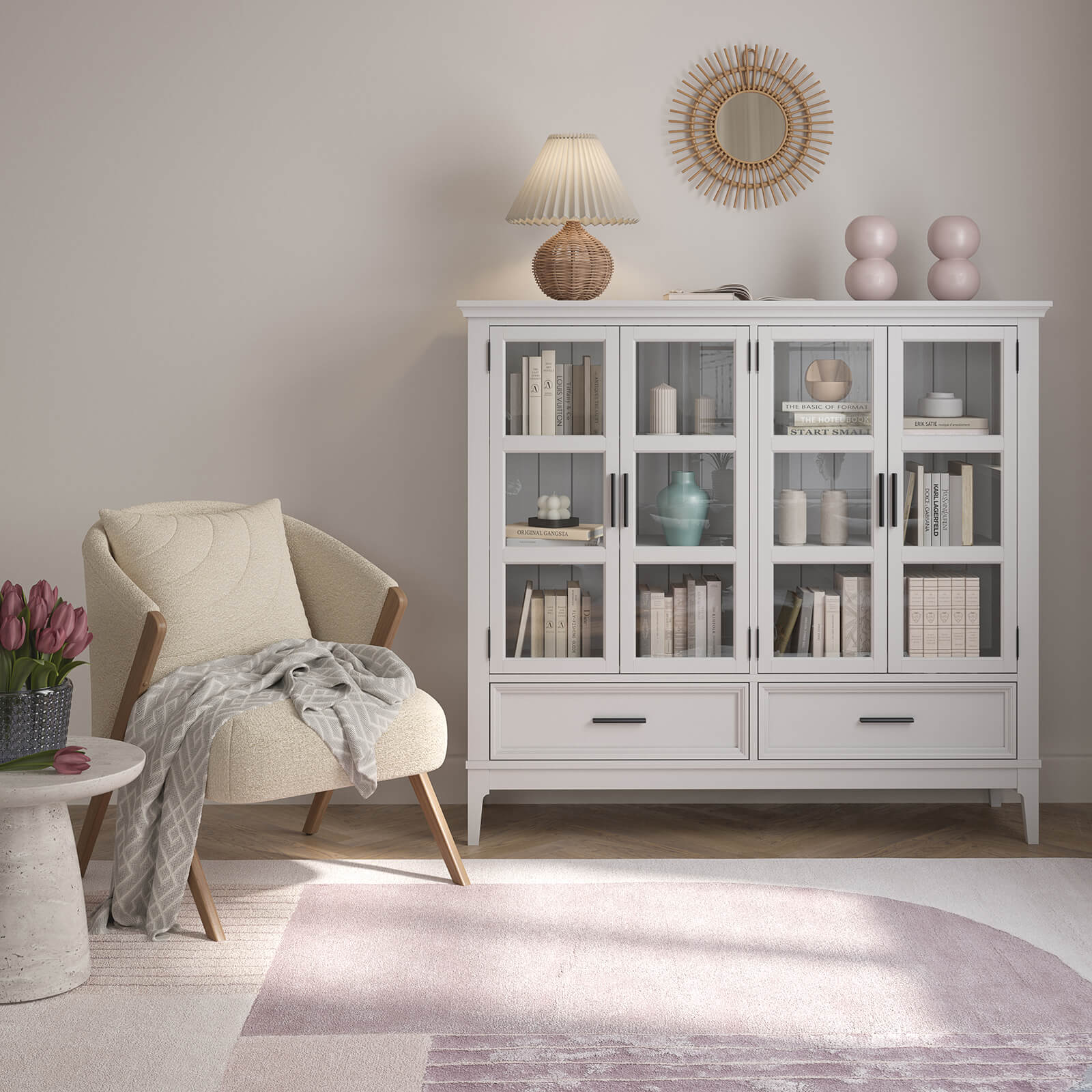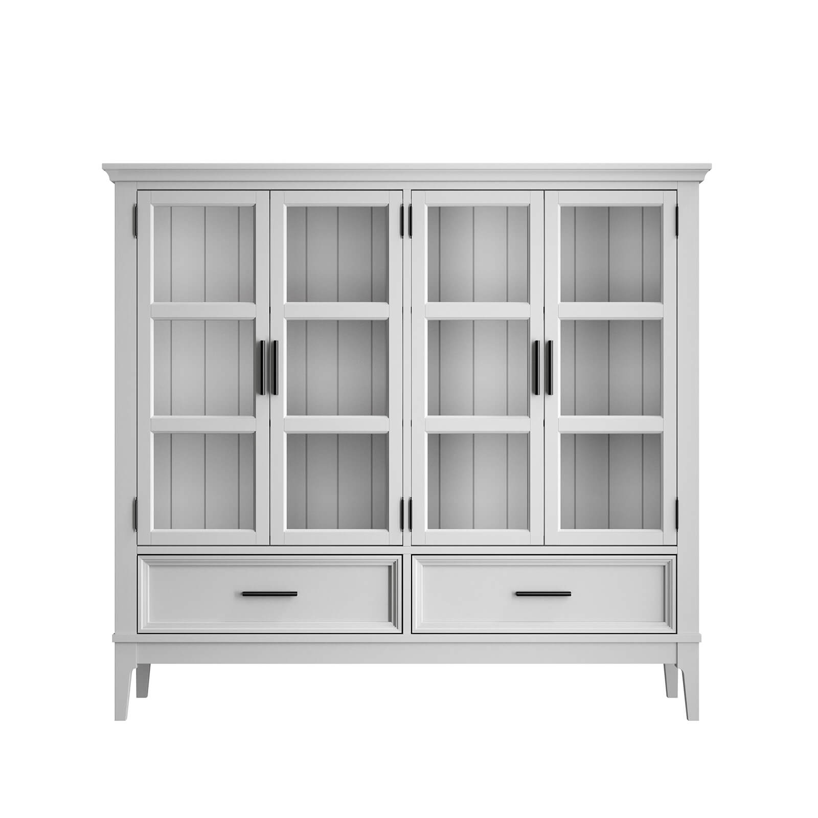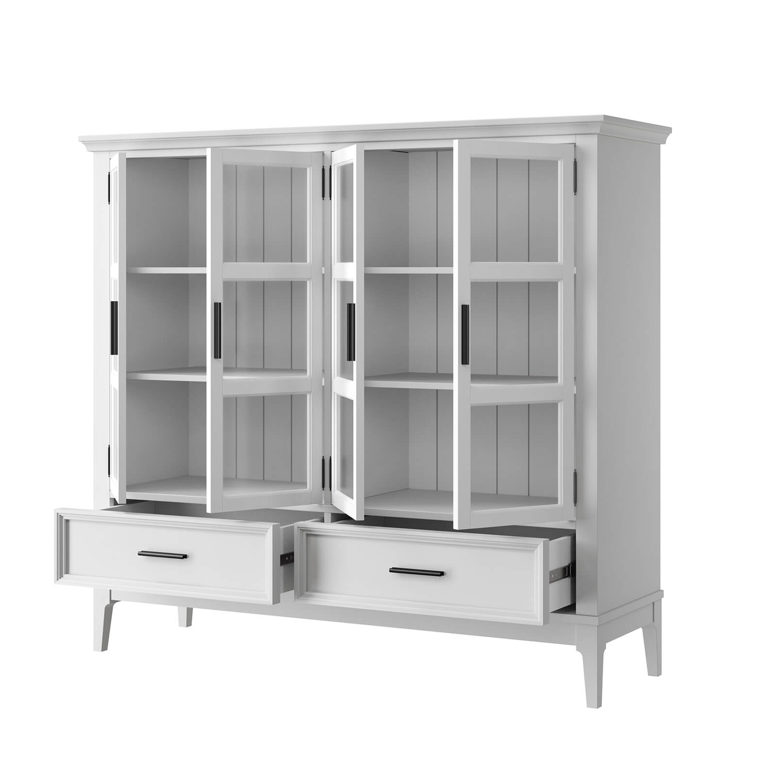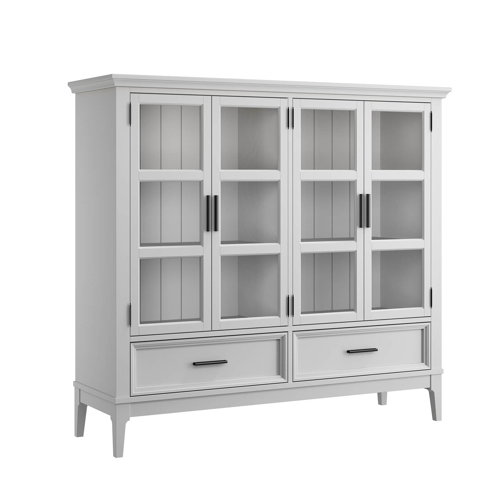 Представляет собой высокий шкаф с двумя отделами с распашными стеклянными дверями, за которыми располагаются съемные полки.