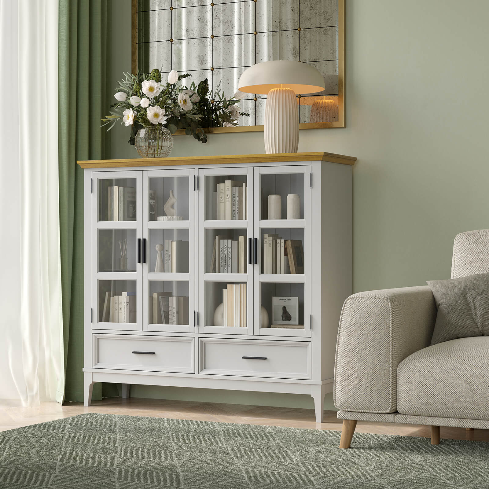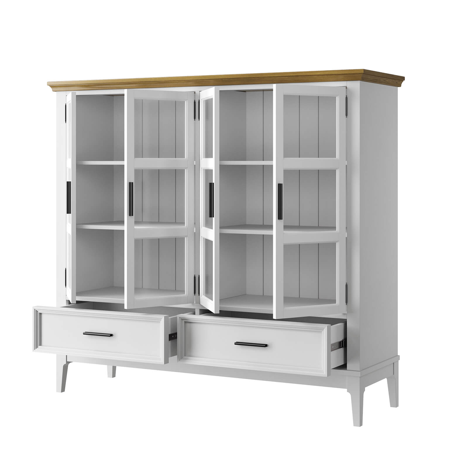 Представляет собой высокий шкаф с двумя отделами с распашными стеклянными дверями, за которыми располагаются съемные полки.