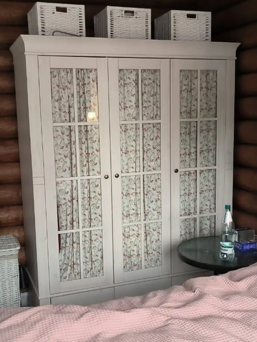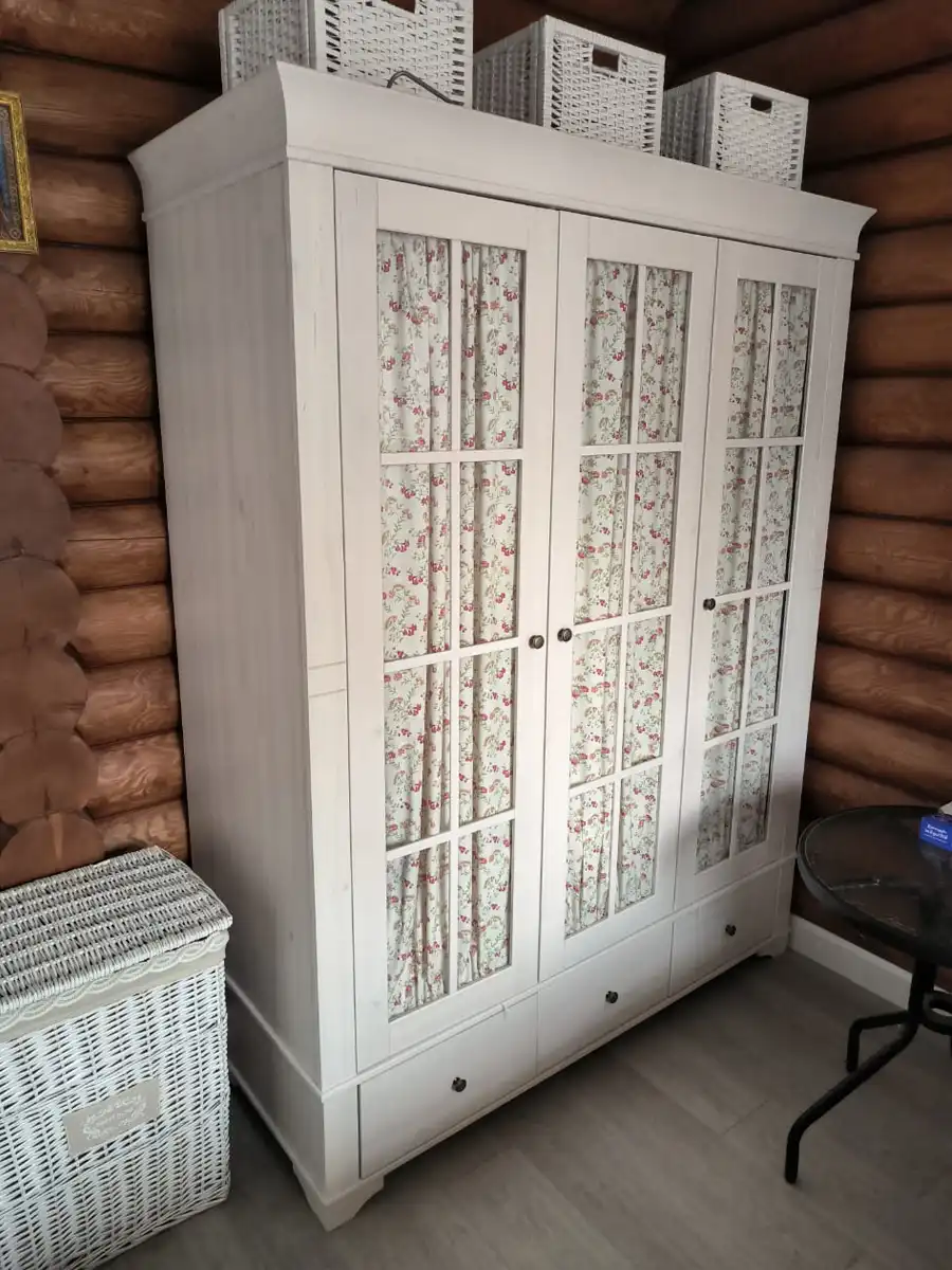 Все три двери шкафа со стеклом. Шкаф имеет 3 отделения, центральное - с 3 полками, регулируемыми по высоте. В 2 боковых - штанга и полка над ней. Внизу шкафа 3 выдвижных ящика с роликовыми направляющими. Дно ящиков ДВП белого цвета. Боковины ящиков выполнены из сосны, не покрыты лаком, но качественно отшлифованы. Вы придете в восторг от той, вместительности, которой располагает данный экземпляр. Штанги, полки и выдвижные ящики моментально решат вопрос хранения. ШКАФ ШТОРКАМИ НЕ КОМПЛЕКТУЕТСЯ!!!