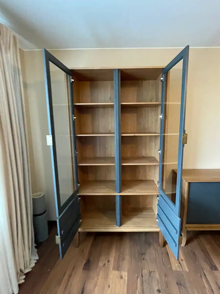Стеллаж имеет две остекленные и две глухие дверцы. За остекленными дверцами по 4 полки, за глухими – отделения без полок. Дверцы навешиваются на петлях с доводчиками для плавного закрывания. На дверцах большие удобные ручки с искусственным состариванием, с двумя вариантами установки. Габариты изделия (ШхГлхВ) 1076х400х2060 мм, вес 79 кг. Поставляется в разобранном виде, в 6 упаковках. Для упаковки используется пятислойный гофрированный картон, что исключает повреждения при перевозке. Гарантия на стеллаж – 1 год.