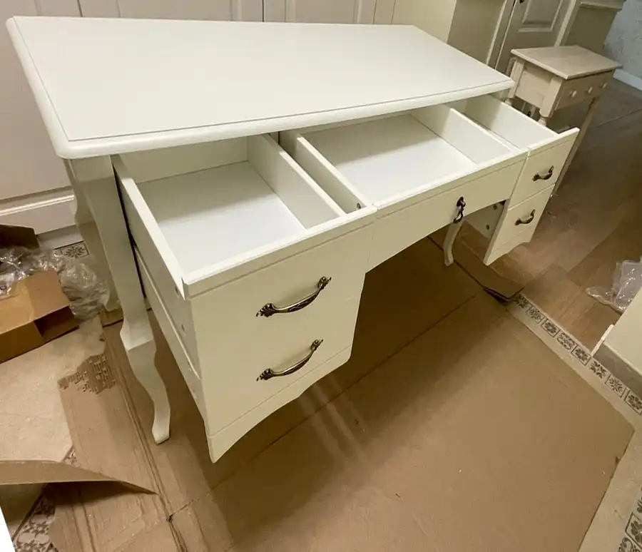 Стол имеет один центральный ящик и по два боковых в каждой тумбе. Внутренние размеры боковых ящиков — 260х430 мм, высота стенок 110 мм. По центру широкий ящик с внутренними размерами 515х430 мм и с высотой стенок 90 мм. Размеры фасадов ящиков: средний 120х550 мм, боковые 163х318 мм. Глубина ящиков 350 мм. Расстояние от пола до среднего ящика 635 мм. Высота ножек 340 мм. Днища ящиков изготовлены из ДВП белого цвета.
