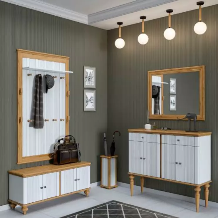 Мебель для прихожей «Рандеву» отличается красивыми фрезерованными фасадами, оригинальными точеными ножками и приятными тонировками. В коллекцию входят обувные тумбы, настенные вешалки, зеркала, подставки для зонтов, навесные полки.