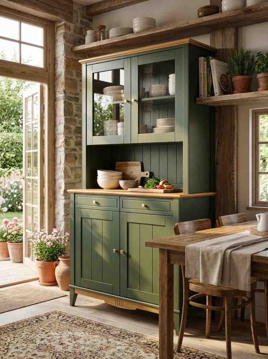 Корпус, фасады, полки и стенки ящиков комода окрашены в красивый зеленый цвет, столешница и декоративная планка – в цвет антик, через который виден природный рисунок древесины. Эта модель также доступна в отделках «белый воск/антик», «серый/антик» и «черный/антик». Красители шведской компании Becker Acroma, применяемые для отделки, проходят строгую сертификацию, безопасны для здоровья, стойкие и долговечные. Фасады и нижняя планка с фрезеровкой. Мебельные ручки-кнопки выполнены в стиле Arts & Crafts. Ручки имеет прямоугольную форму с четкими гранями и выступающей пирамидальной центральной частью. Цвет изделия – латунь.