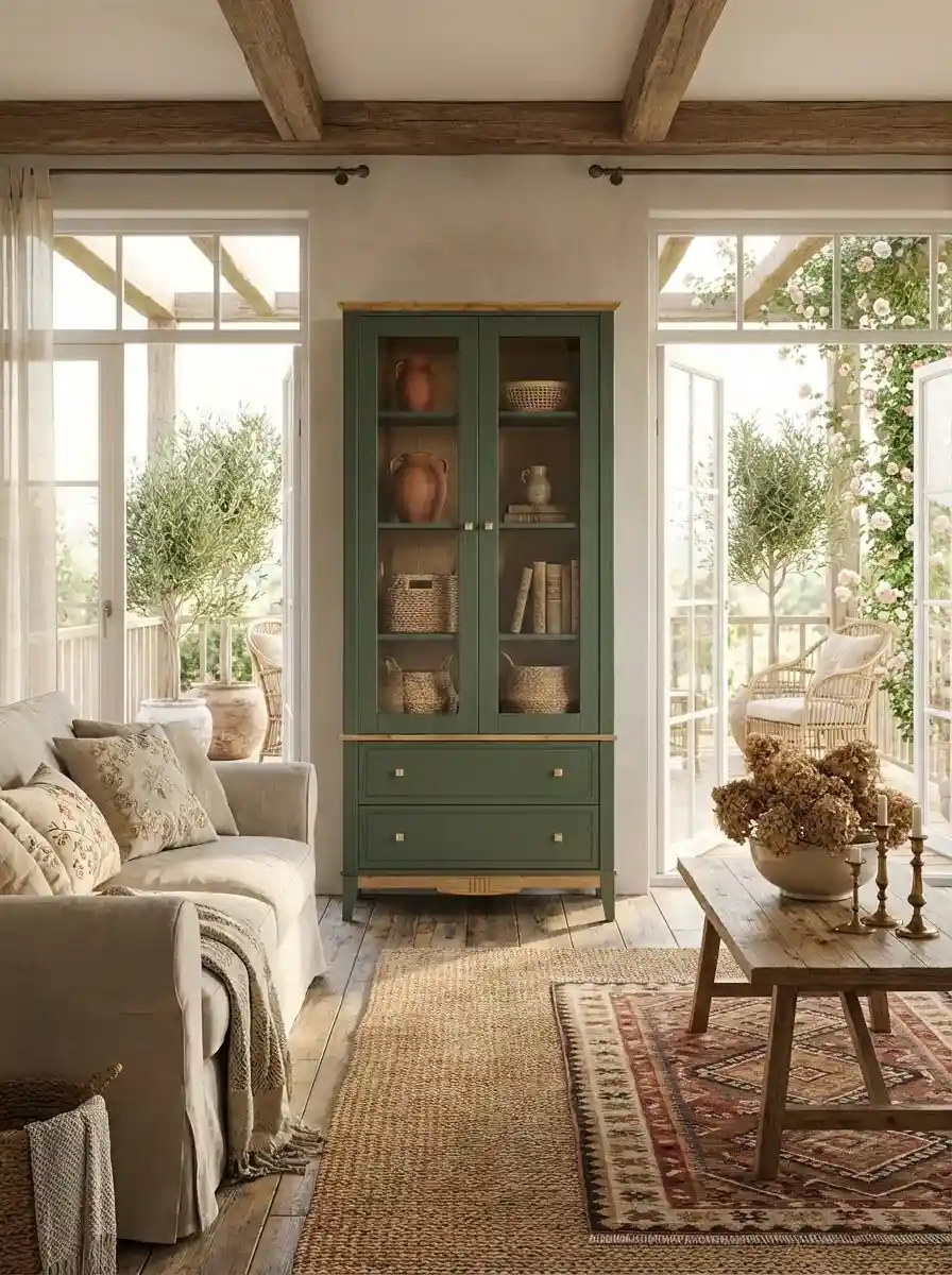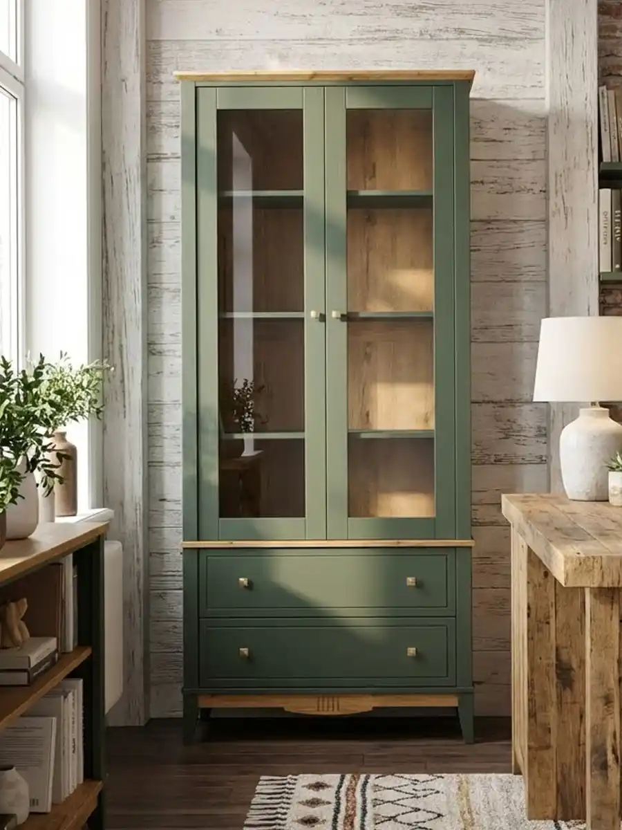 Корпус шкафа и полки окрашены в глубокий зеленый цвет, а карниз, перекрытие и нижняя планка – в приятный цвет антик, через который виден природный рисунок древесины. Доступна эта же модель шкафа в отделке «серый/антик», «черный/антик»и «белый/антик». Донья ящиков и задняя стенка сделаны из оргалита древесного оттенка, а стенки ящиков – из массива сосны и отделаны в цвет корпуса. Фасады и нижняя планка украшены фрезеровкой. Ручки-кнопки выполнены в стиле Arts & Crafts и имеет прямоугольную форму с четкими гранями и выступающей пирамидальной центральной частью. Цвет латунь.