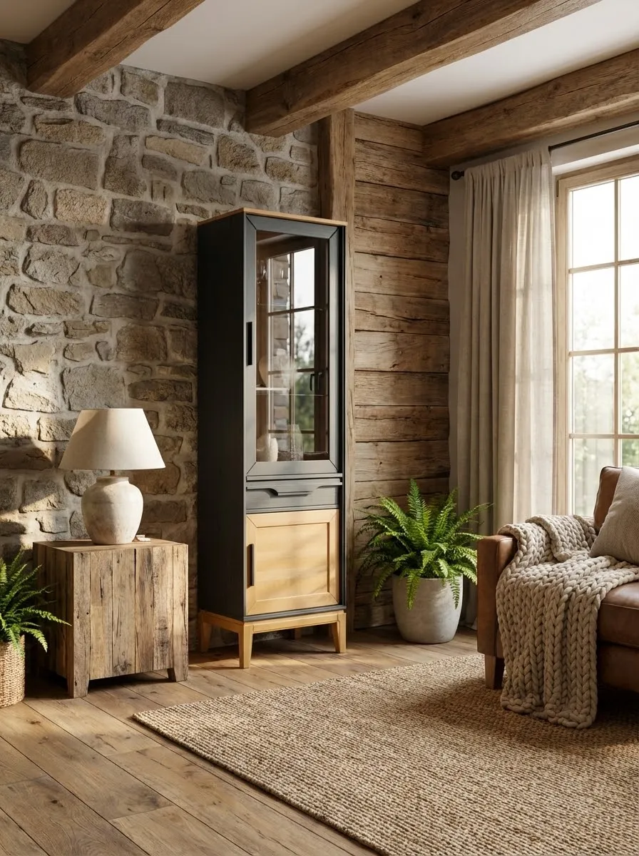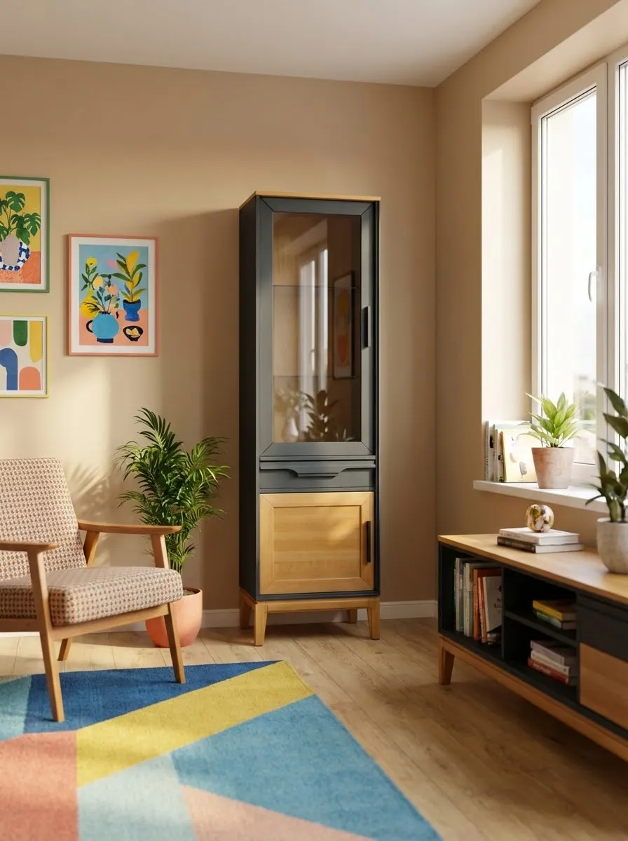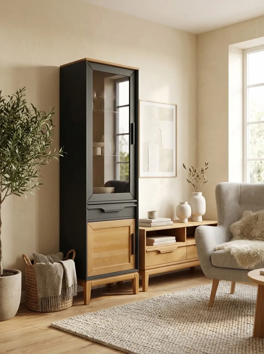 Шкаф имеет основание с высокими крепкими ножками, которые обеспечивают ему устойчивость. Кроме того, шкаф не нужно сдвигать во время уборки: под ним остается достаточно пространства, в том числе для уборки роботом-пылесосом. За остекленной дверцей расположены полки, на которых можно хранить посуду или сувениры. На дверцах и ящике чёрные профильные ручки.