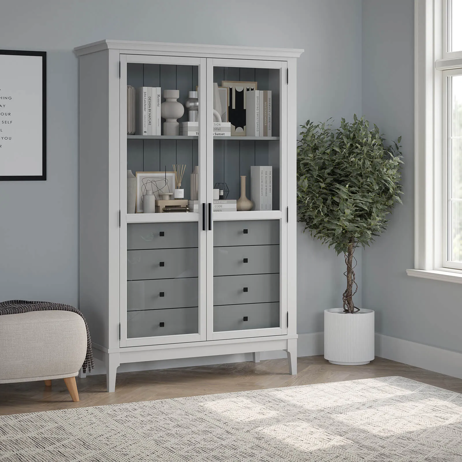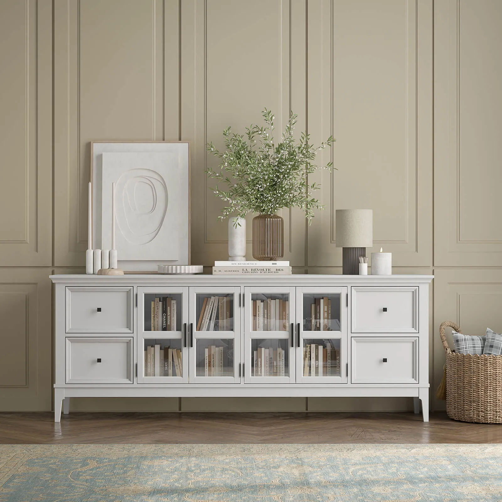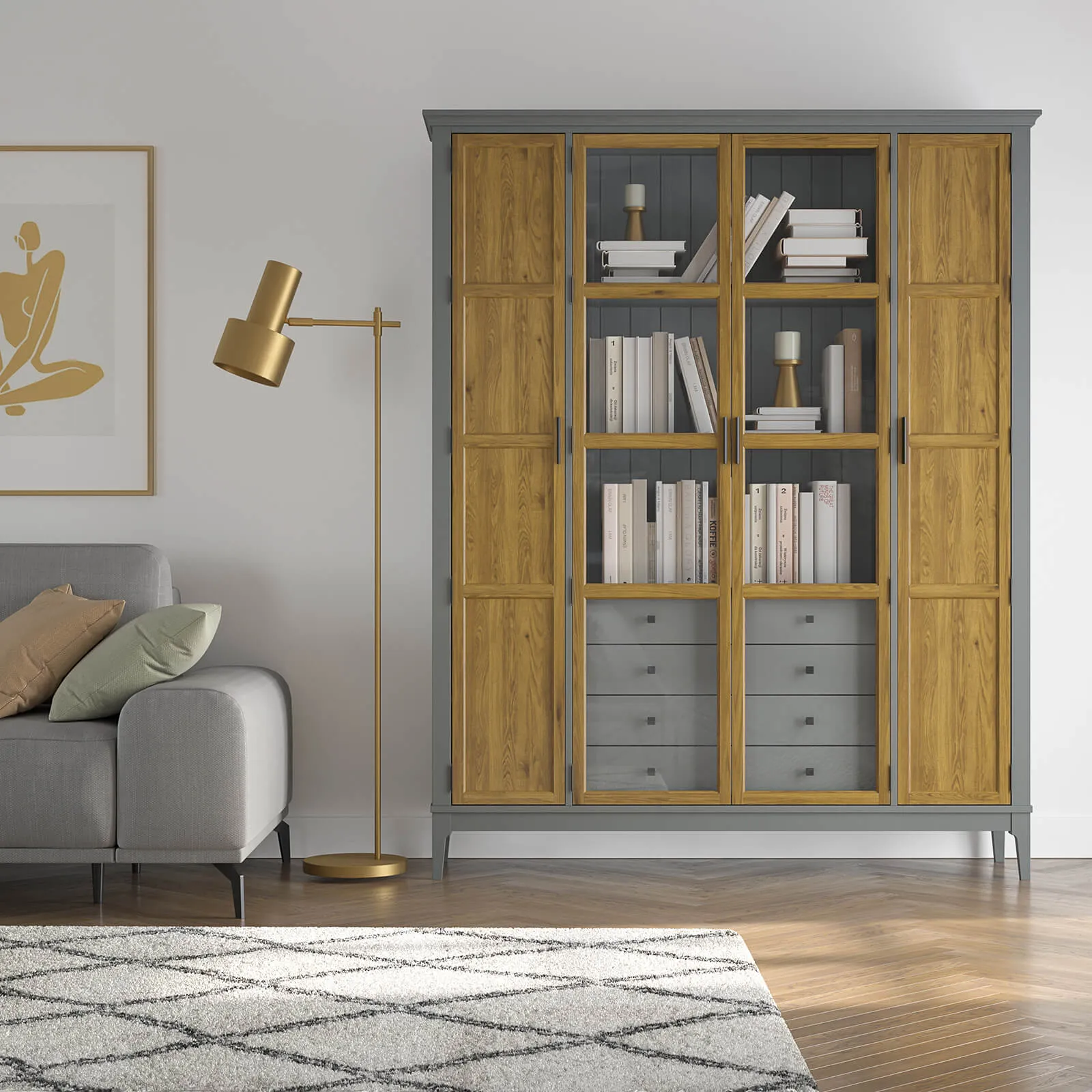 Мебель для гостиной «Квадро-С» изготавливается в простом и красивом скандинавском стиле. В коллекции представлены шкафы для посуды, книжные шкафы, стеллажи с открытыми полками, комоды с дверцами и ящиками.
