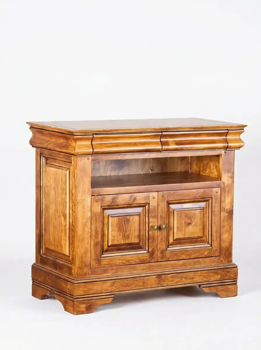 У комода две глухие дверцы, за которыми находится отделение с полками. На дверцах устанавливаются металлические ручки-кнопки. Над каждой дверцей расположена открытая ниша, а над нишей, в карнизе, находятся два выдвижных ящика. Габариты тумбы (ШхГлхВ) 914х470х800 мм, вес 61 кг. Поставляется в собранном виде, гарантия на изделие – 1 год. Обратите внимание, что тумба, как и вся коллекция «Луи Филипп», изготавливается на заказ. Сроки изготовления уточняйте у наших продавцов в салонах или по телефону на сайте.