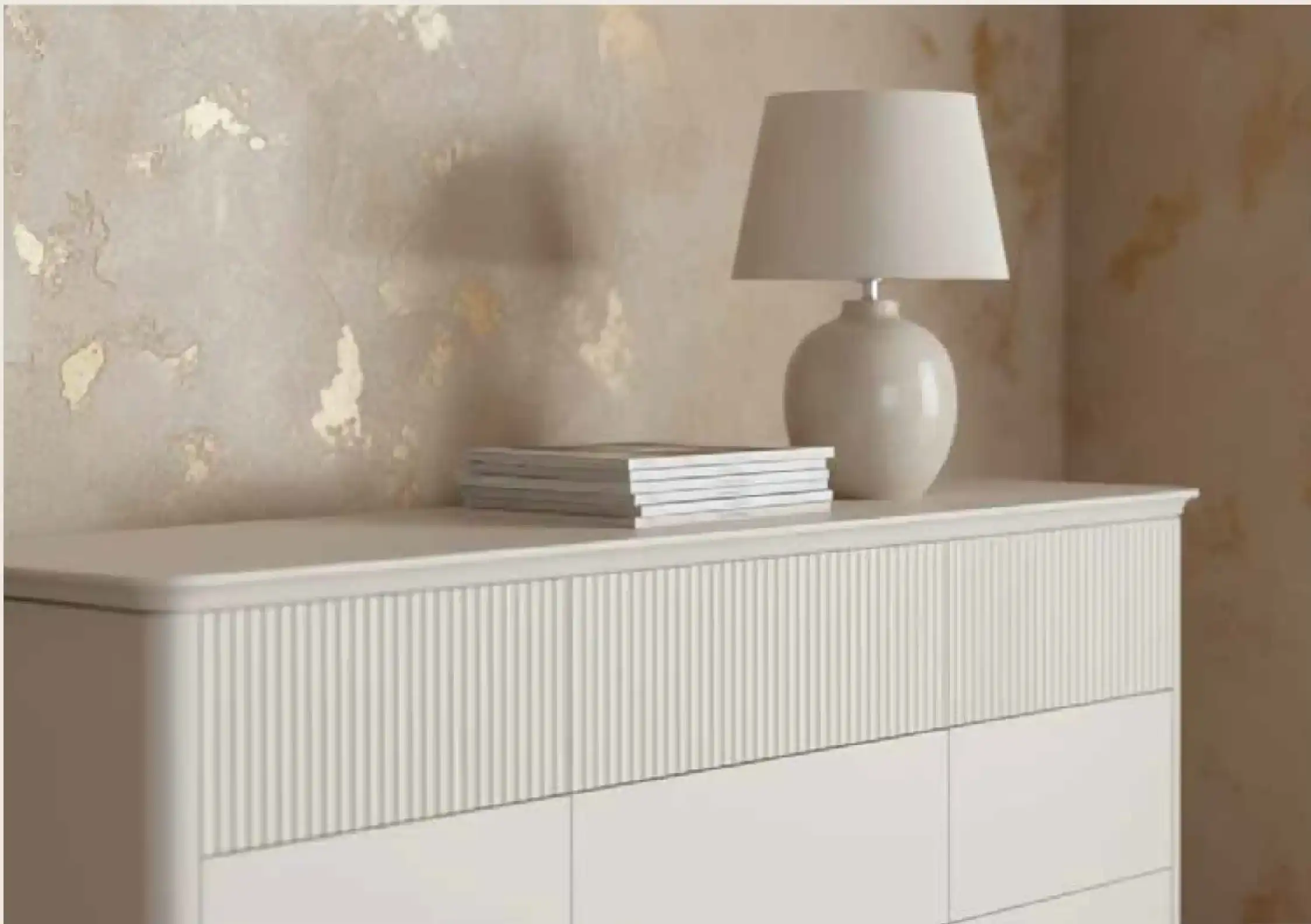 Материал корпусов и фасадов – МДФ высокого качества, устойчивый к влажности. Задние стенки предметов изготавливаются из березовой фанеры, из нее же делаются донья ящиков, при этом они покрываются мягкой обивкой. Стенки ящиков из массива бука. Стандартно изделия предлагаются в бежевом цвете, но есть возможность выбрать один из других цветов или оттенков: черный, молоко, слоновая кость, шоколад, розовая пудра, сланцево-серый, серо-коричневый и другие. Доступно несколько вариантов обивочных тканей, также с выбором цвета: велюр, микровелюр, букле, искусственная кожа, рогожка.