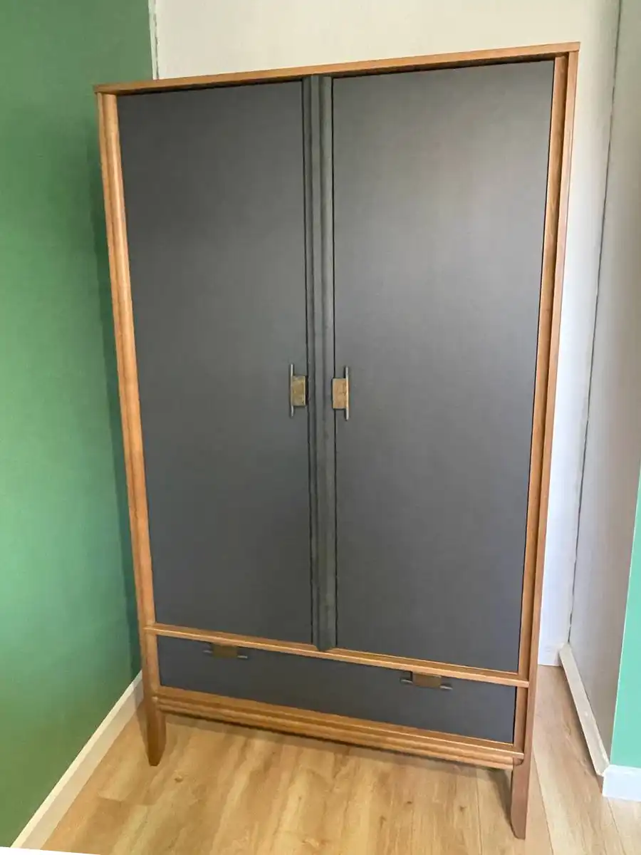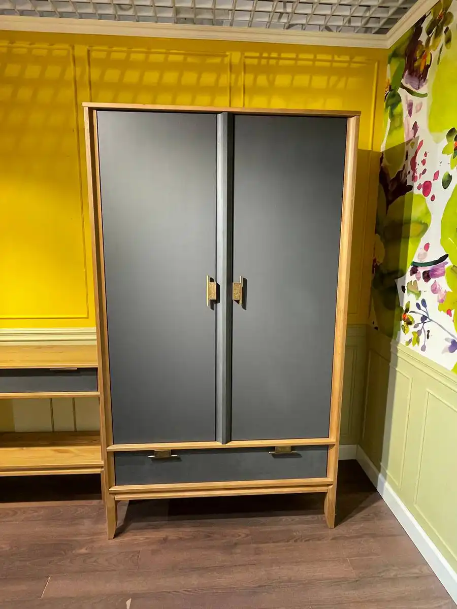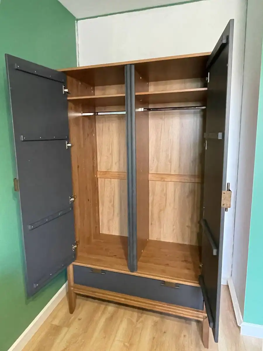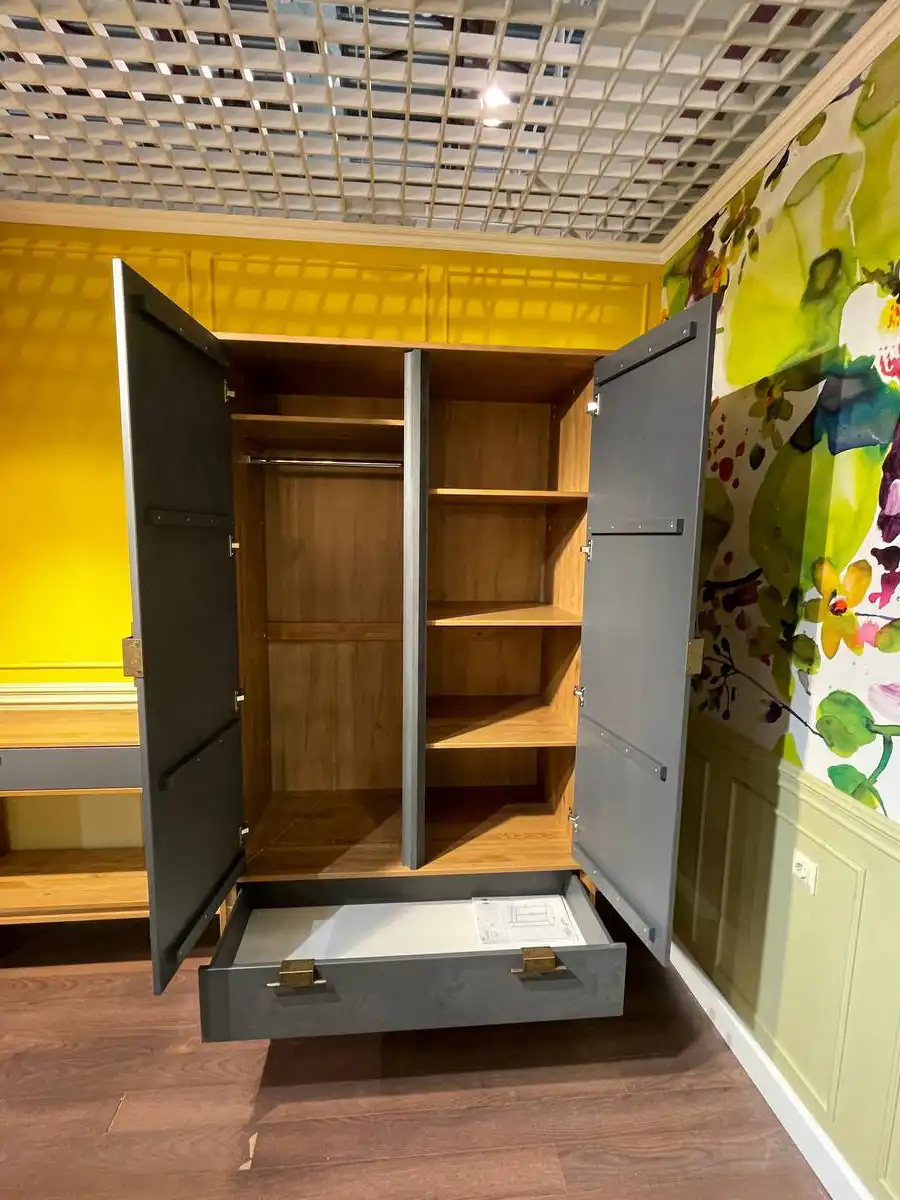Шкаф имеет две распашные дверцы и один выдвижной ящик. За правой дверцей находится отделение с 3 полками, которые можно переставлять по высоте. За левой дверцей – отделение с полкой и штангой для одежды. В левое отделение можно дополнительно установить полки (продаются отдельно). Дверцы навешиваются на петлях с доводчиками для плавного закрывания. Ящик устанавливается на шариковых направляющих с доводчиками. На дверцах и ящике большие удобные ручки с искусственным состариванием, с двумя вариантами установки.