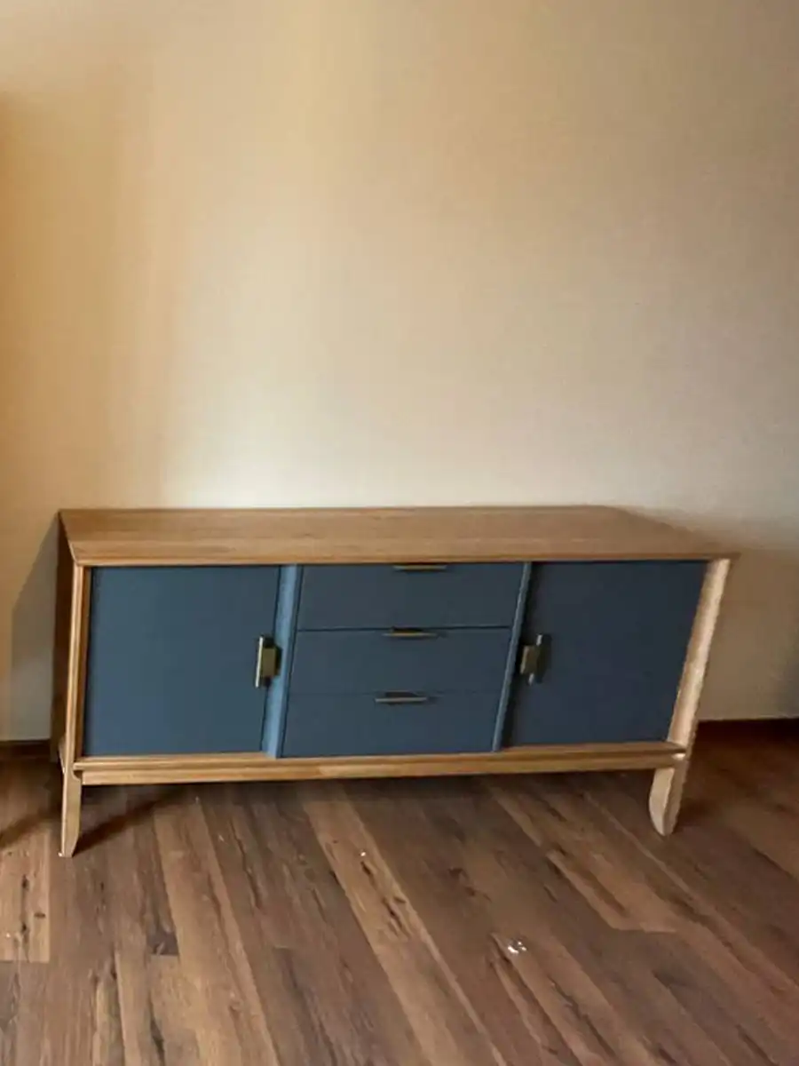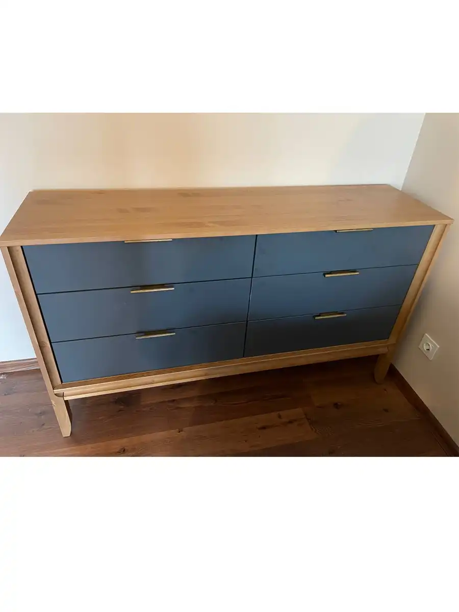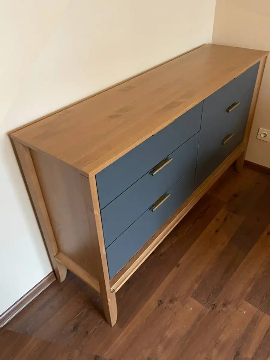 Комод имеет две распашных дверцы и три выдвижных ящика. За каждой дверцей расположено отделение с полкой, где можно удобно разложить одежду, бельё или другие вещи. Дверцы оснащены петлями с доводчиками для плавного и бесшумного закрывания. Ящики устанавливаются на шариковых направляющих с доводчиками. Максимальная нагрузка на ящик составляет 30 кг. Ручки имеют два варианта установки, можно выбрать более удобный. Габариты комода 1800х400х852 мм, он компактный, но при этом достаточно вместительный.