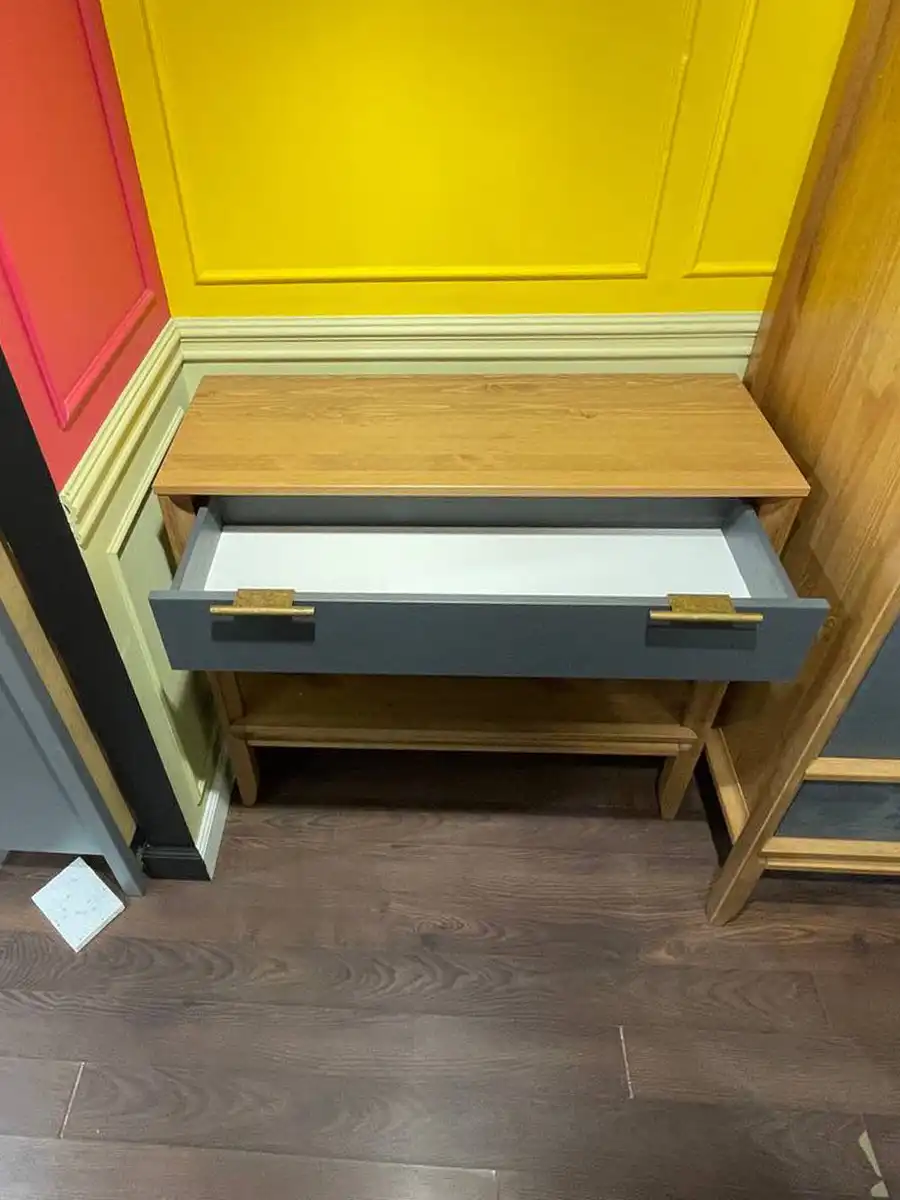 Консоль имеет один выдвижной ящик и нижнюю полку. Ящик устанавливается на шариковых направляющих с доводчиками, для плавного и бесшумного закрывания. Максимальная нагрузка на ящик составляет 30 кг. Для ящика предусмотрены большие удобные ручки с двумя вариантами монтажа, на выбор. Габариты консоли 1000х360х850 мм, вес 22 кг.