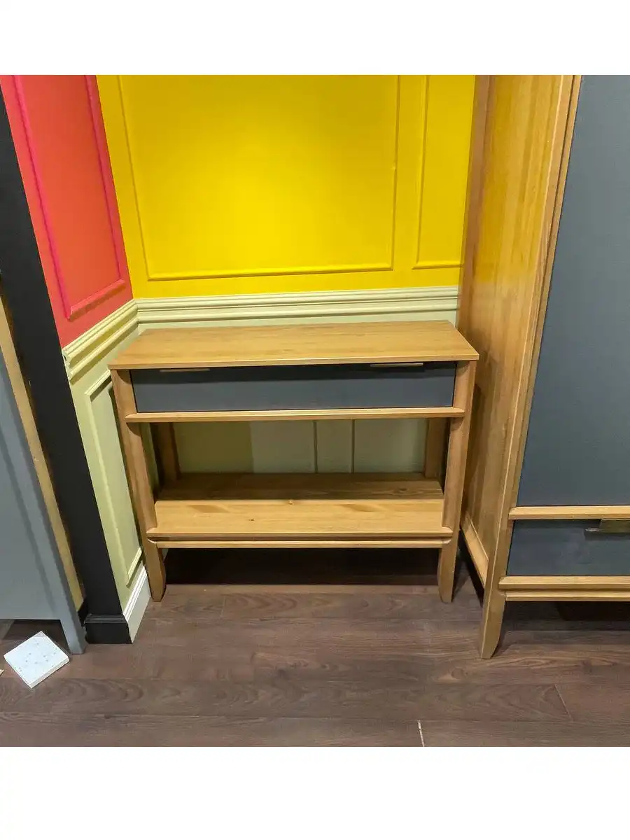 Консоль «Бридж» выполнена из красивого, натурального и долговечного материала – массива сосны. Корпус и ножки окрашены в светло-коричневый цвет, фасад в серый цвет. Высокие тонкие ножки придают консоли лёгкость и изящество.