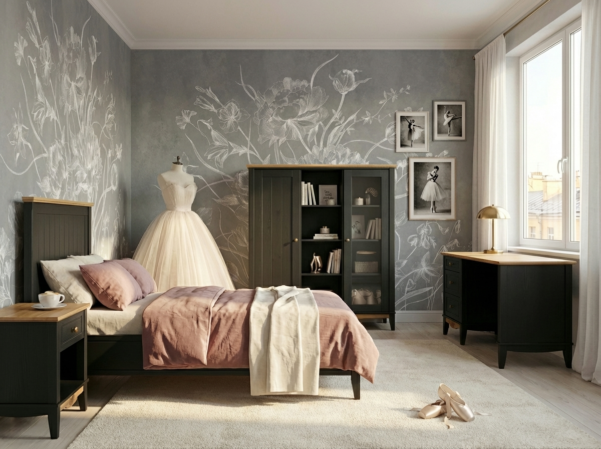 Столешница и нижняя декоративная планка под тумбой окрашены в цвет антик (светло-коричневый), через него просматривается текстура дерева. Корпус и фасады окрашены в черный цвет. Можно заказать эту же модель стола в отделках «серый жемчуг/антик», «белый кварц/антик» и «изумруд/антик» Для окрашивания применяются матовые лаки на водной основе от шведской компании Becker Acroma. Лаки соответствуют европейским стандартам качества, не пахнут и не провоцируют аллергию.
